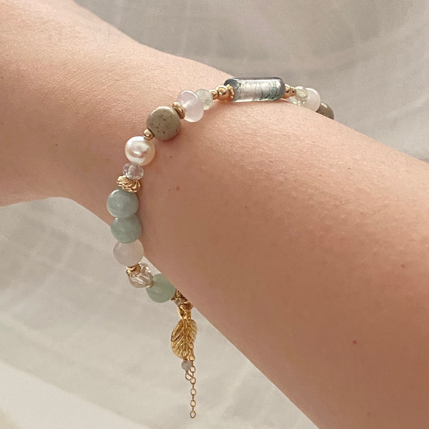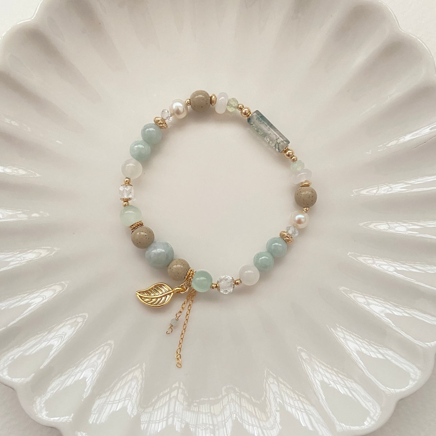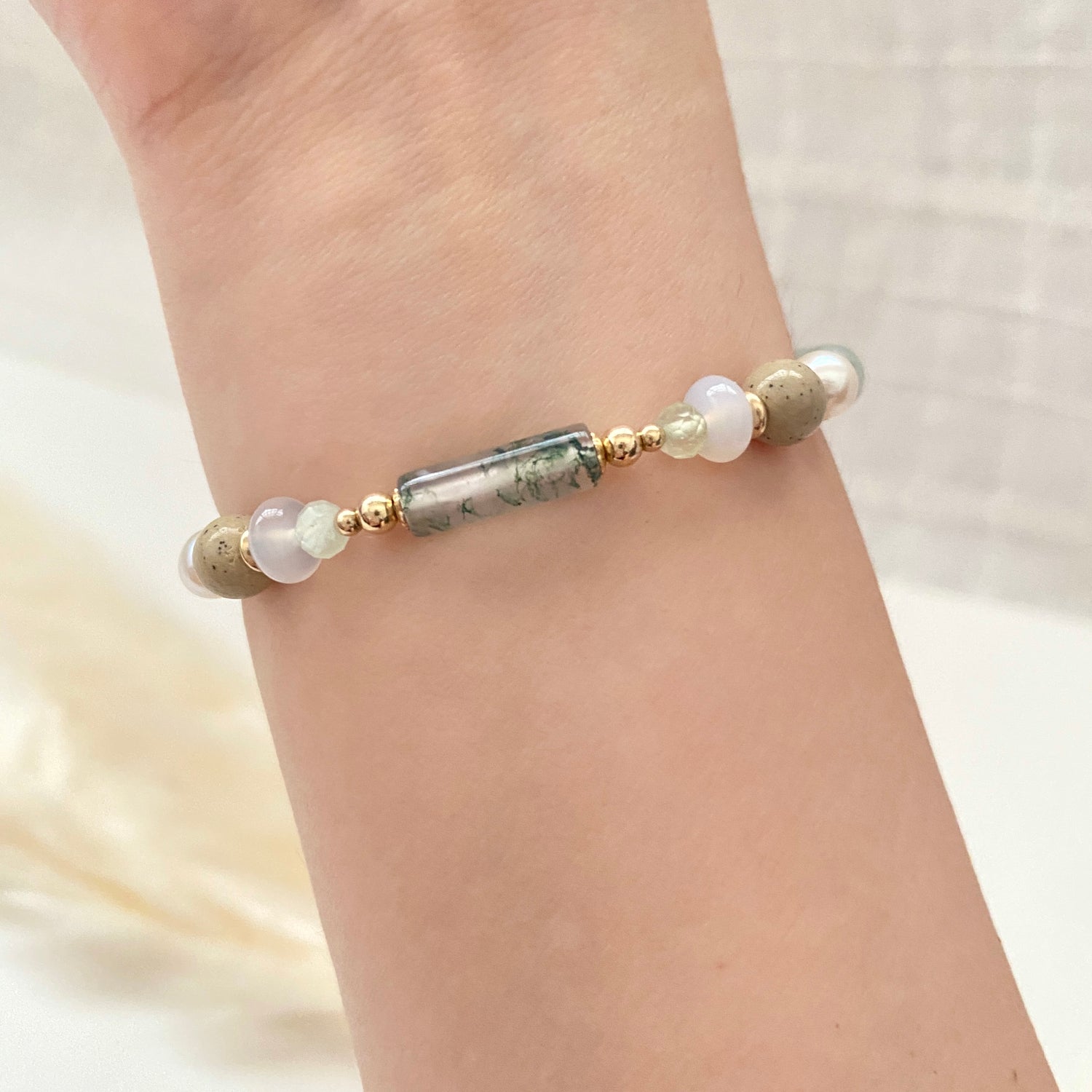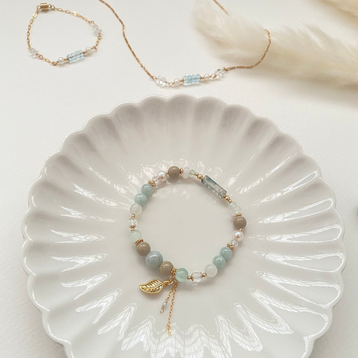 Burmese Jade. Taiwan Hokutolite, Afghanistan green calcite. Freshwater pearl, Moss agate. White Chalcedony, White Topaz, Prehnite