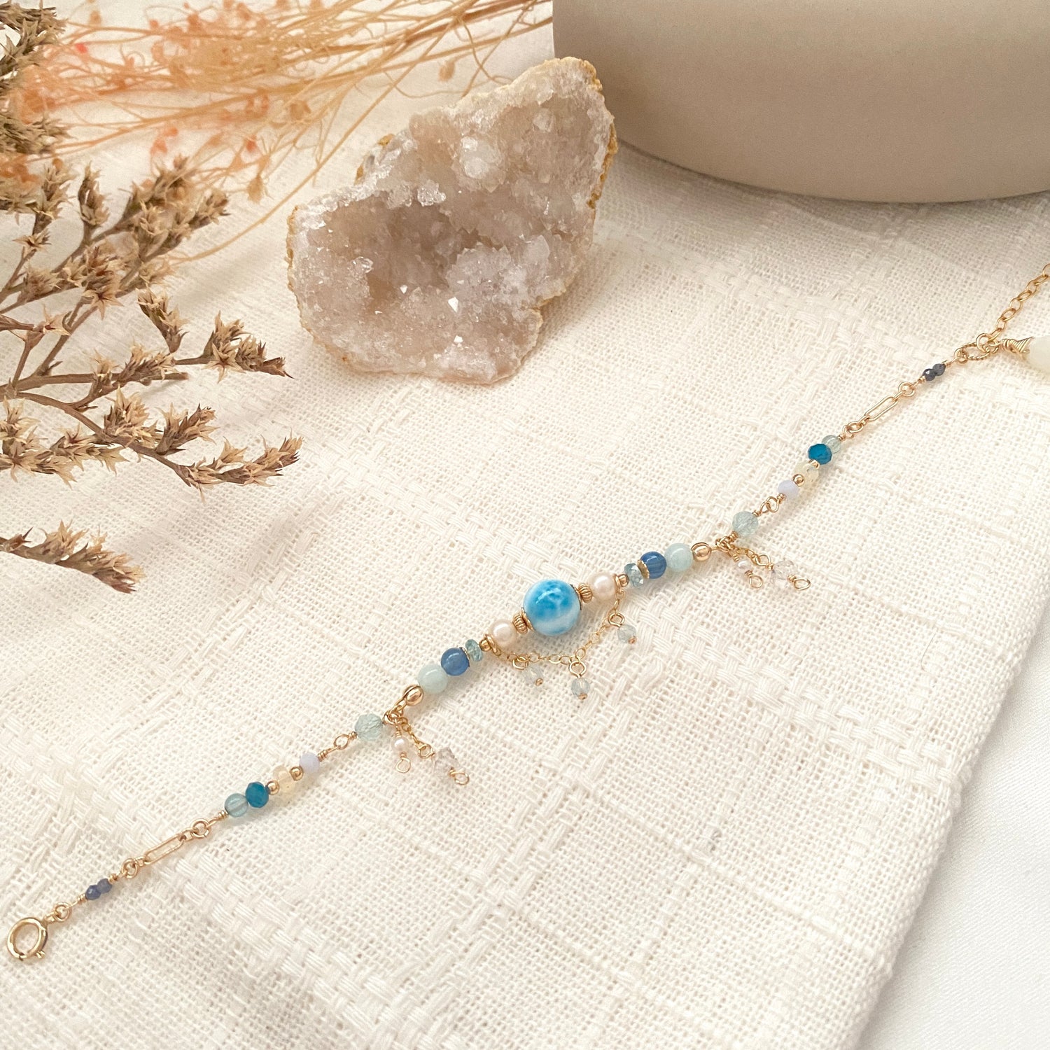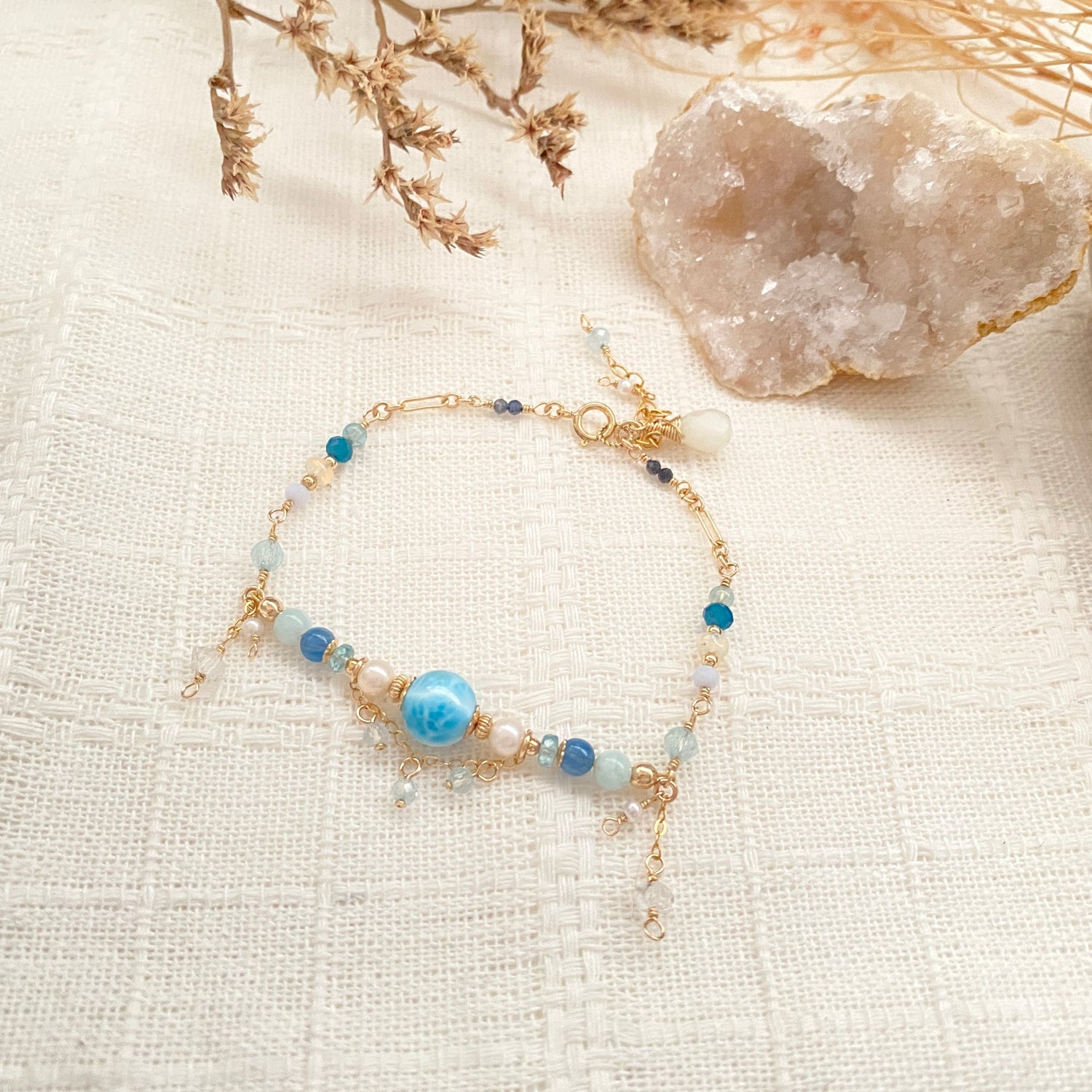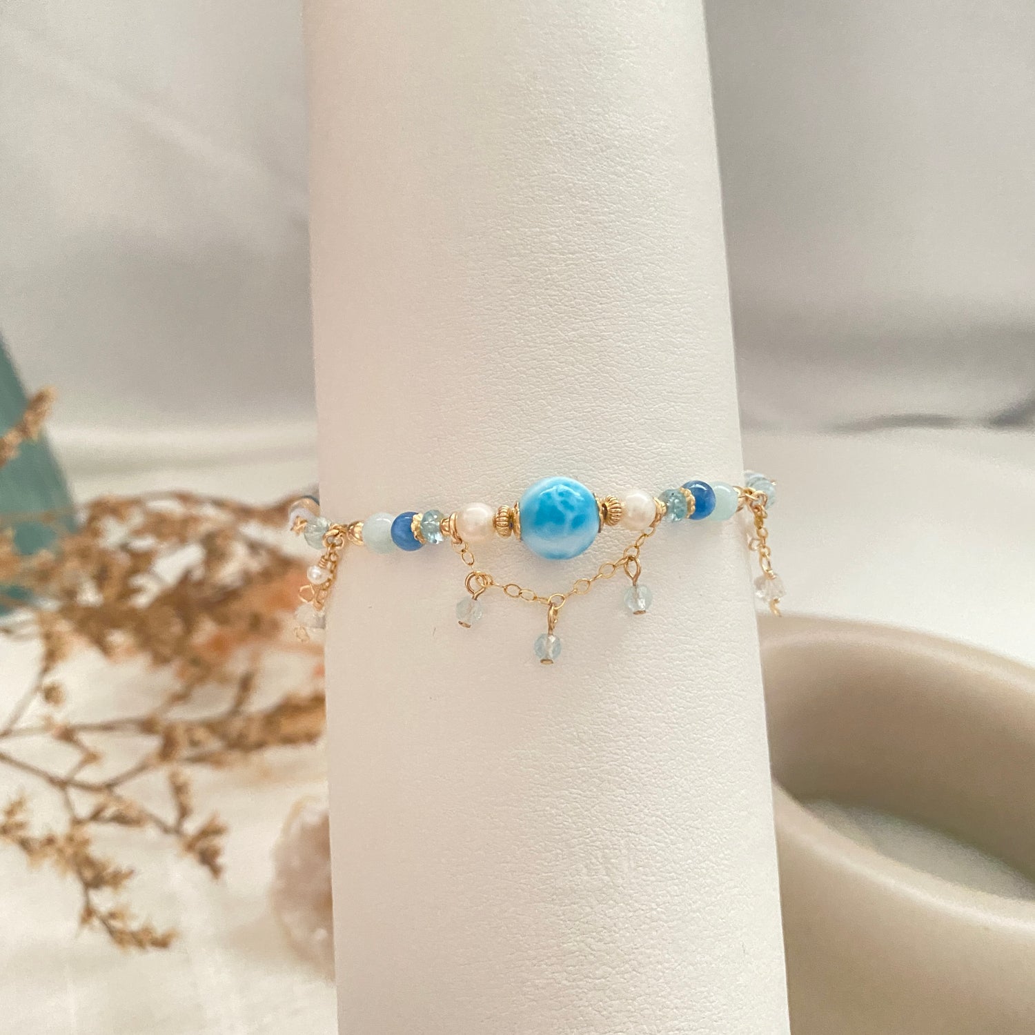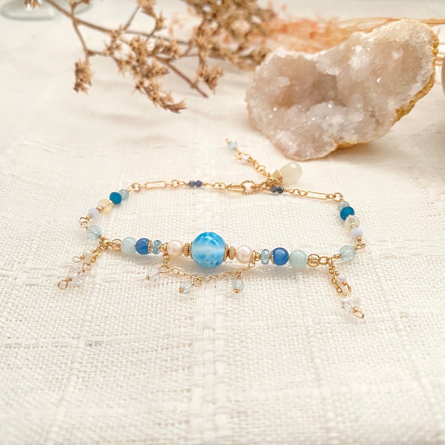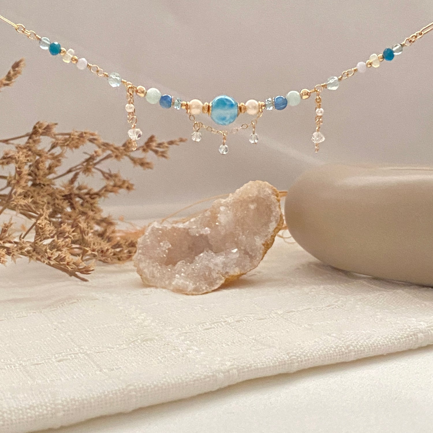 Larimar (8mm), Blue zircon, Blue beryl, Kyanite, Aquamarine, Rainbow moonstone, Freshwater pearl, Apatite, Ethiopian opal, Lapis Lazuli