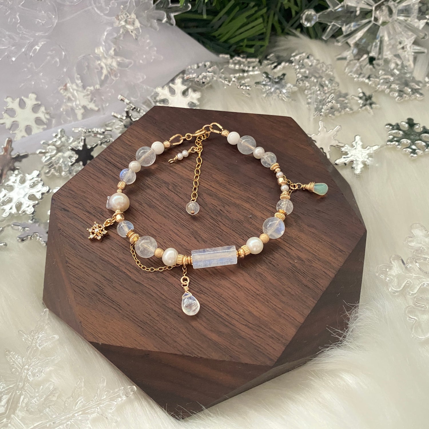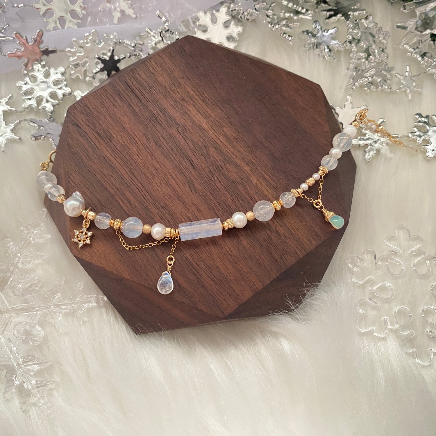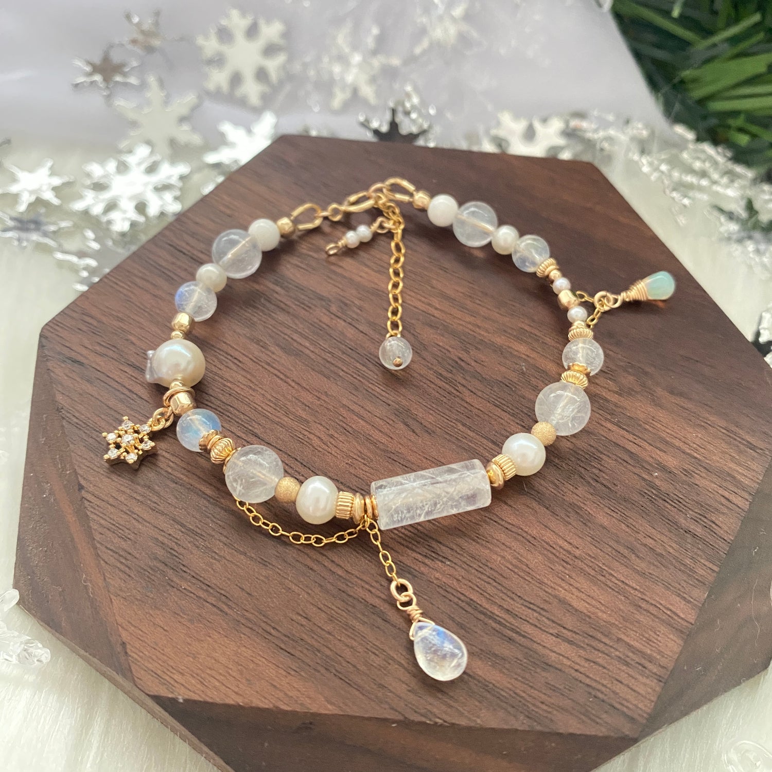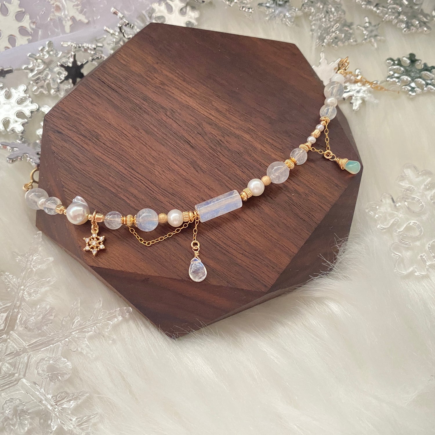 Rainbow moonstone, Ethiopian opal, Blue needle quartz, Tridacna, Freshwater pearl, Akoya pearl