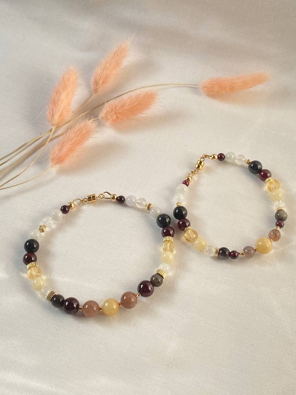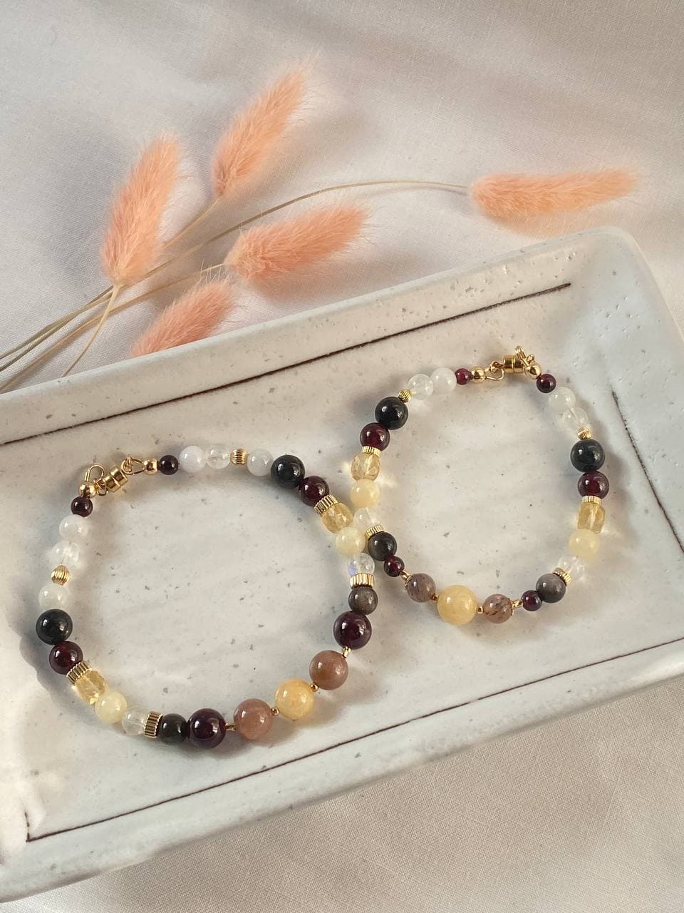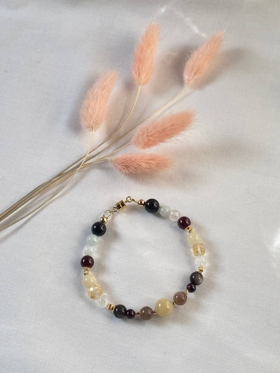(Star) garnet, Yellow morganite, Black sunstone, Burmese jade, Black jade, Citrine, Moonstone, Garnet
