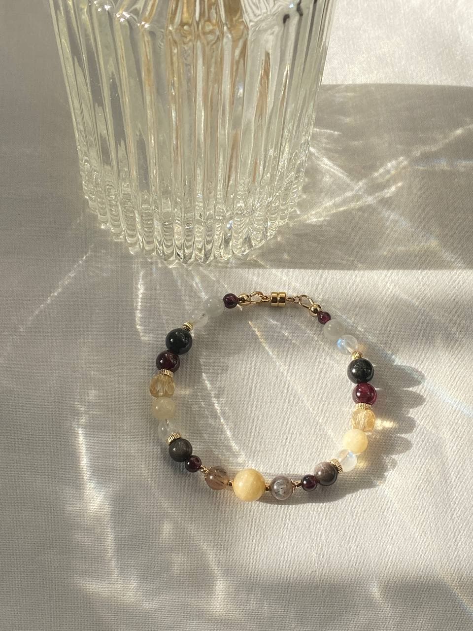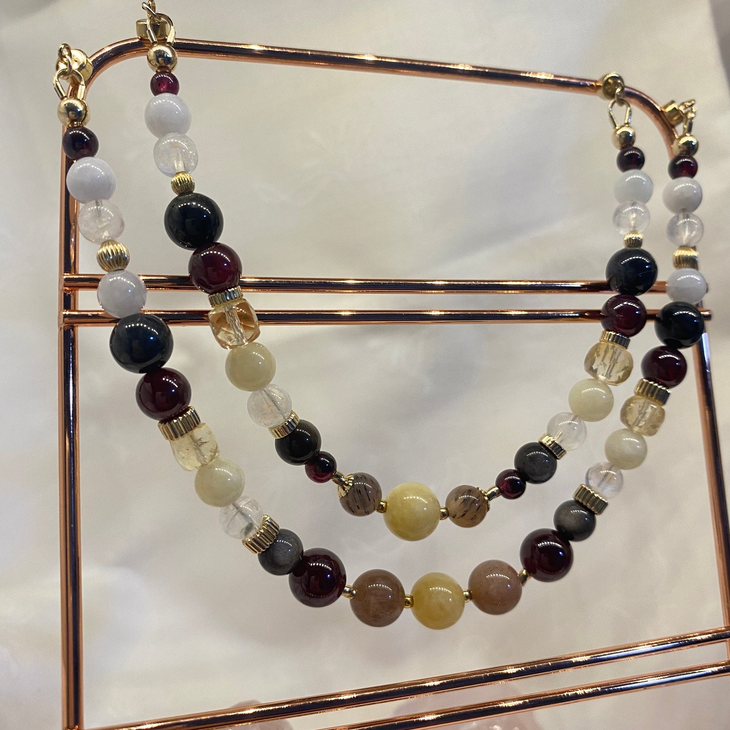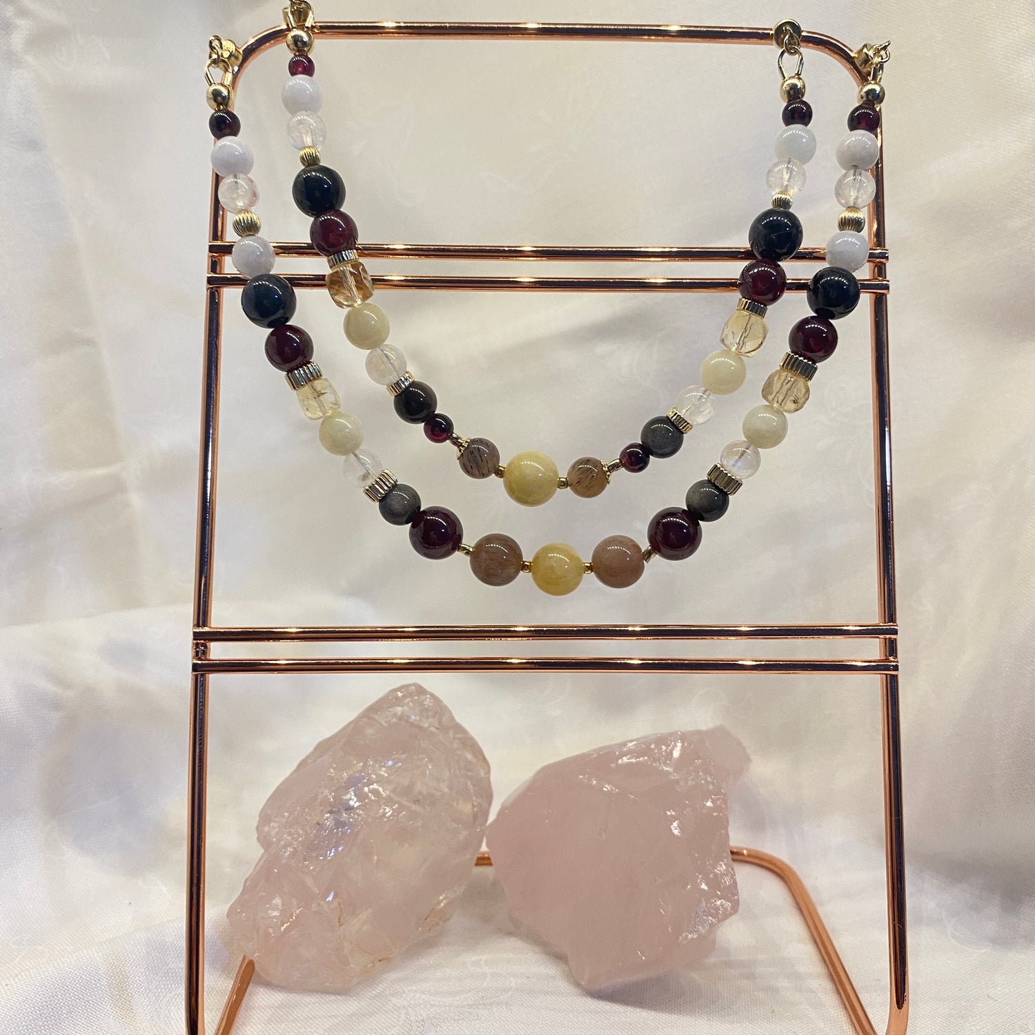(Star) garnet, Yellow morganite, Black sunstone, Burmese jade, Black jade, Citrine, Moonstone, Garnet