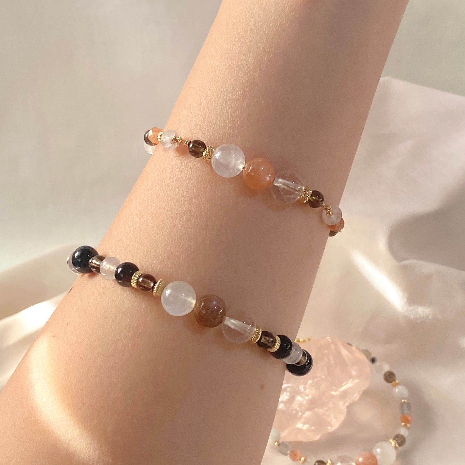 (Star) Rose quartz, Black sunstone, Moonstone, Labradorite, Smoky Quartz, Black jade, Silver sheen obsidian, Black Tourmalinated Quartz, Pink morganite, Gray moonstone star