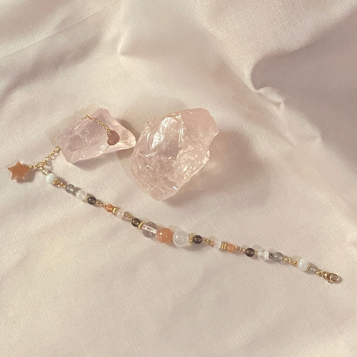 (Star) Rose quartz, Peach Moonstone, Moonstone, Labradorite (includes purple/ pink/ orange flash), Smoky Quartz, Burmese Jade, Pink Morganite. Black Tourmalinated Quartz, Sunstone, Peach moonstone Star
