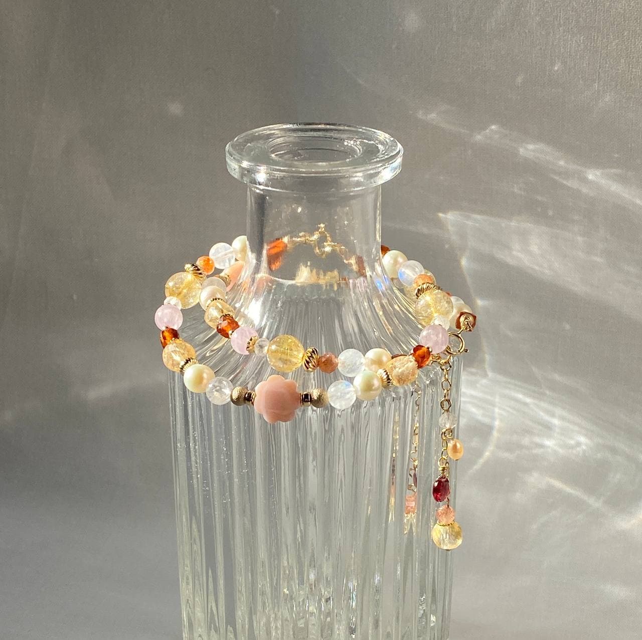 Pink shell, Freshwater pearl, Citrine, Golden rutilated Quartz, Hessonite Garnet, Moonstone, Kunzite, Ice rhodochrosite