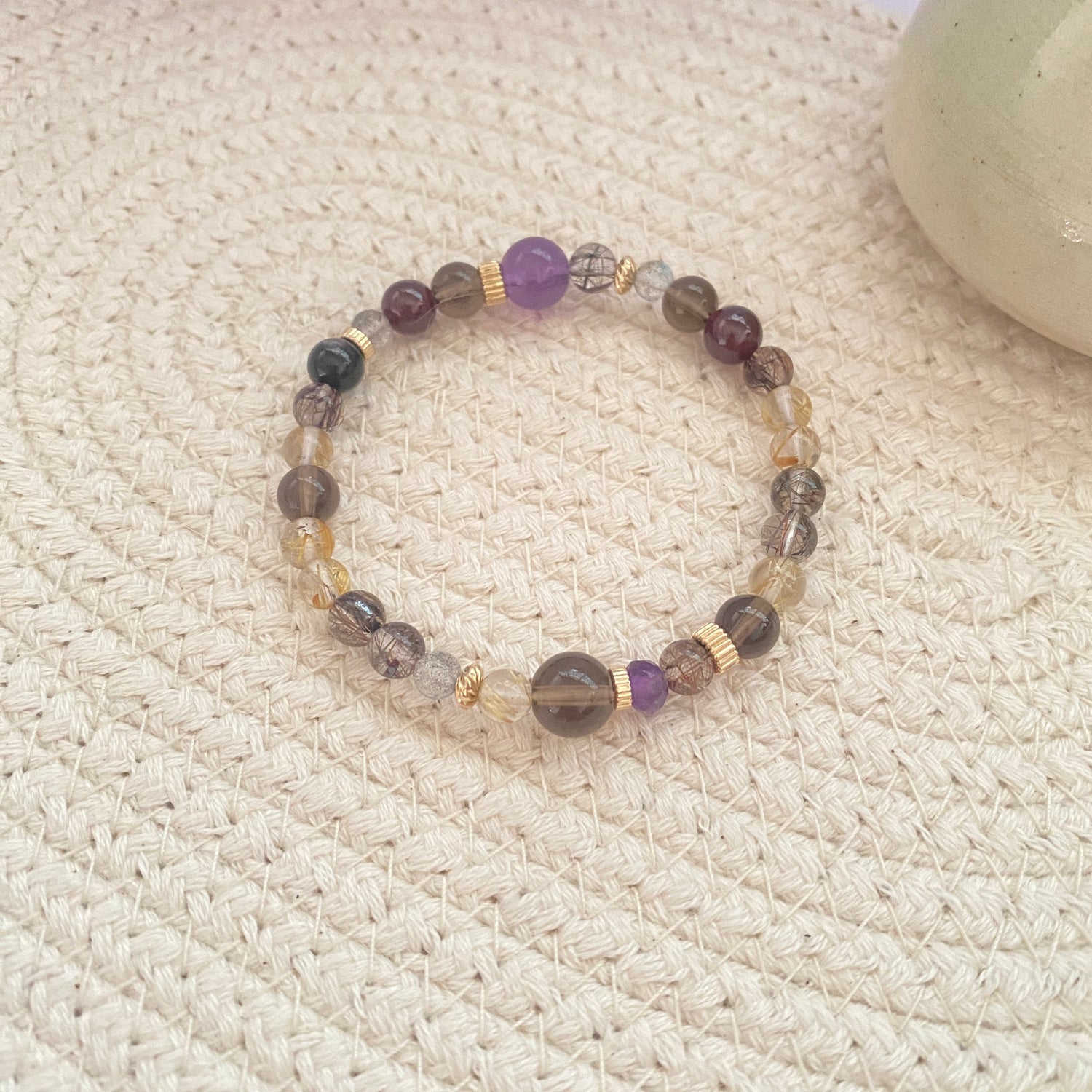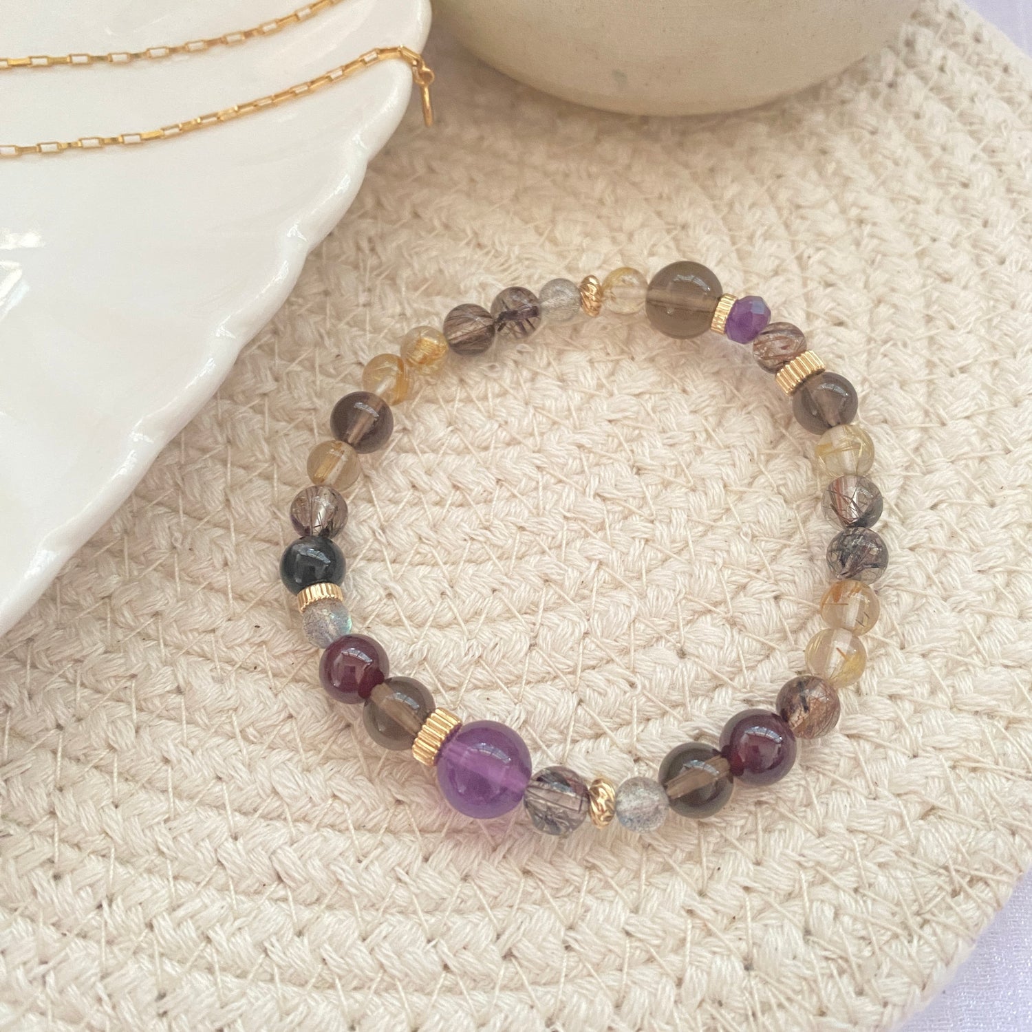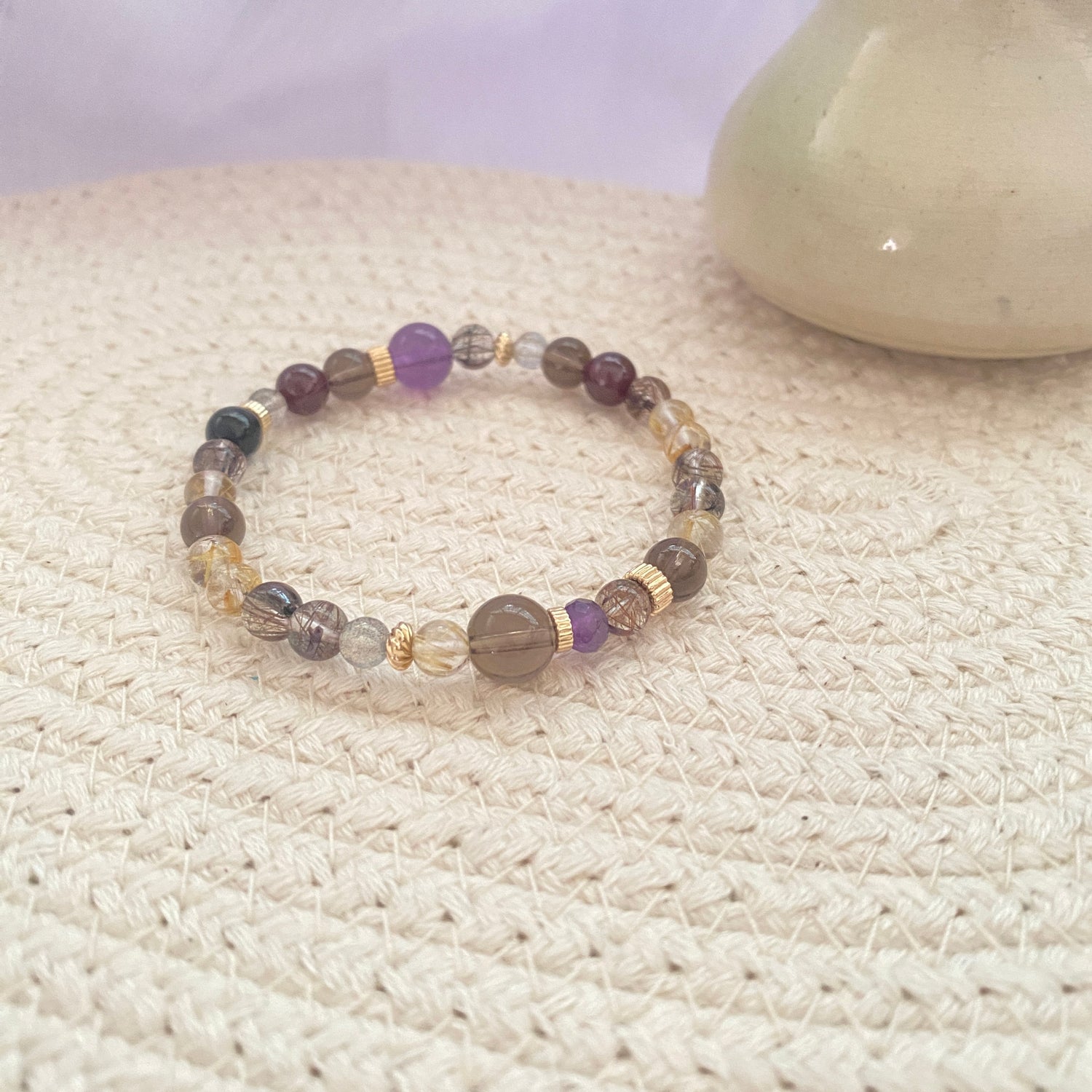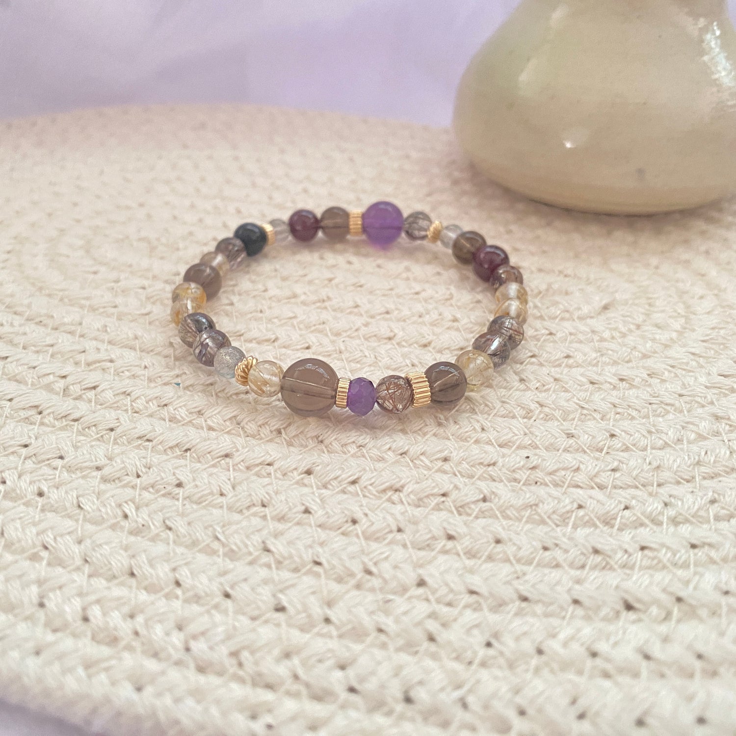 Garnet, Smoky quartz, Amethyst, Golden rutilated quartz, Copper black rutilated quartz, Labradorite