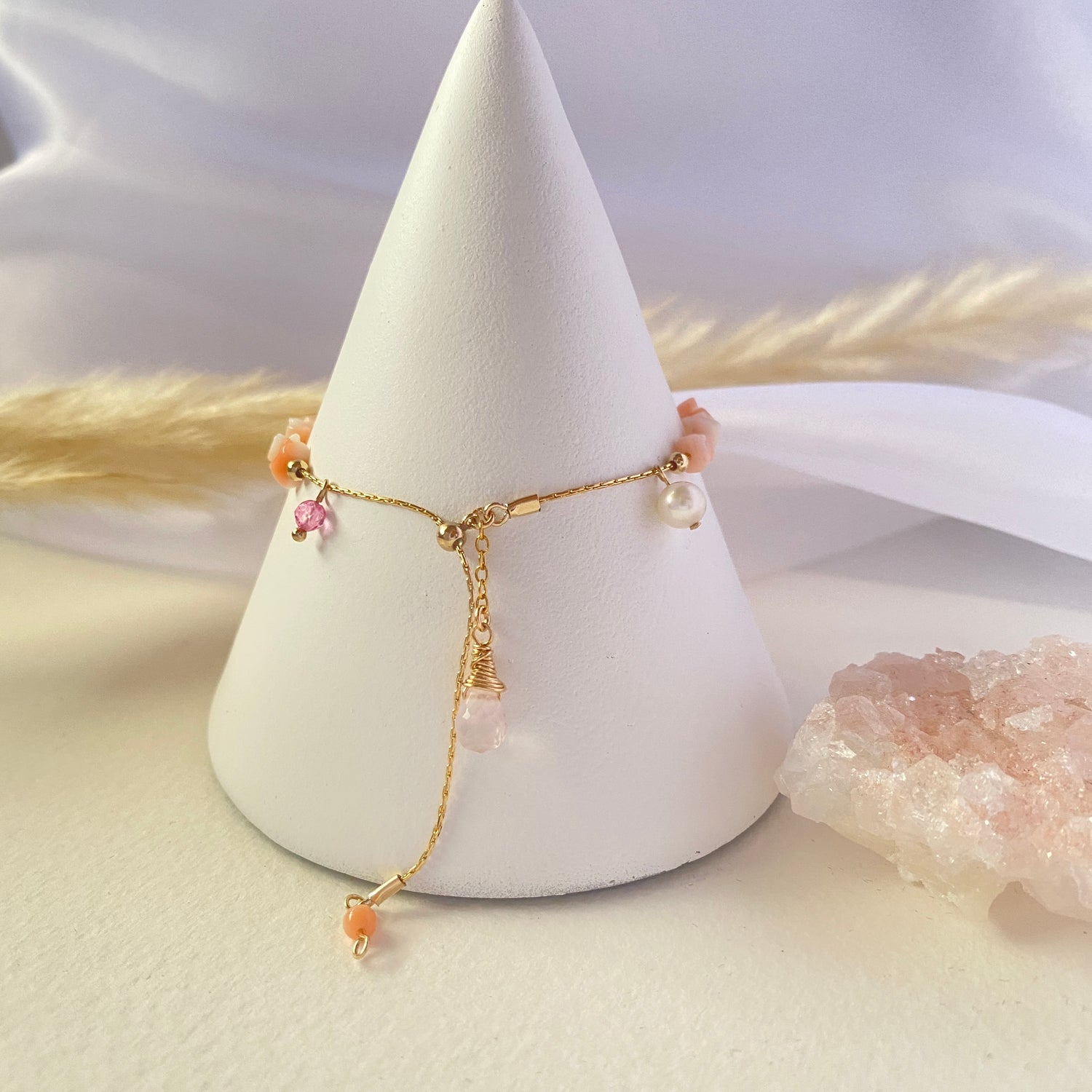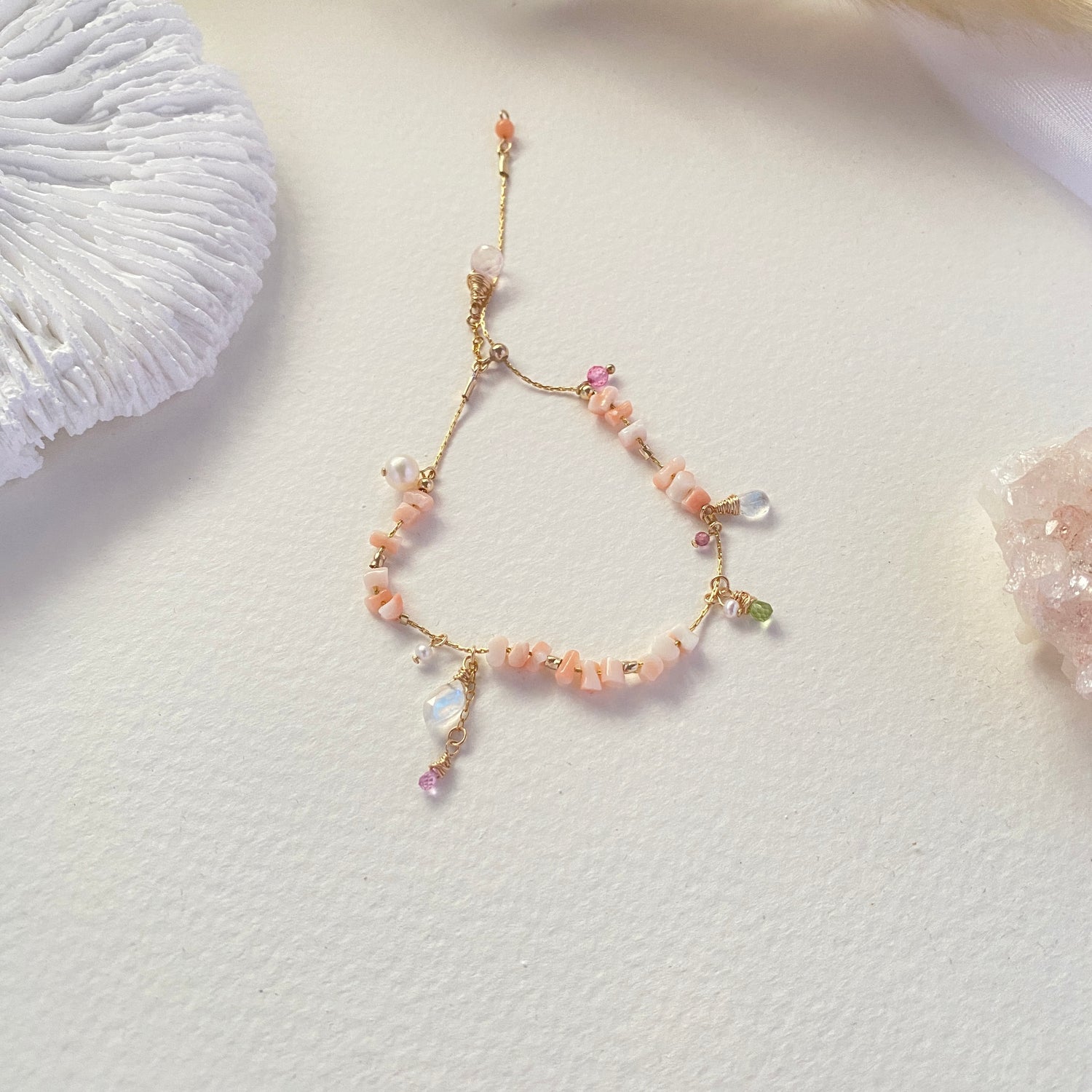 Pink coral branch, pink sapphire, peridot, garnet, rose quartz, freshwater pearl, rainbow moonstone, pink topaz