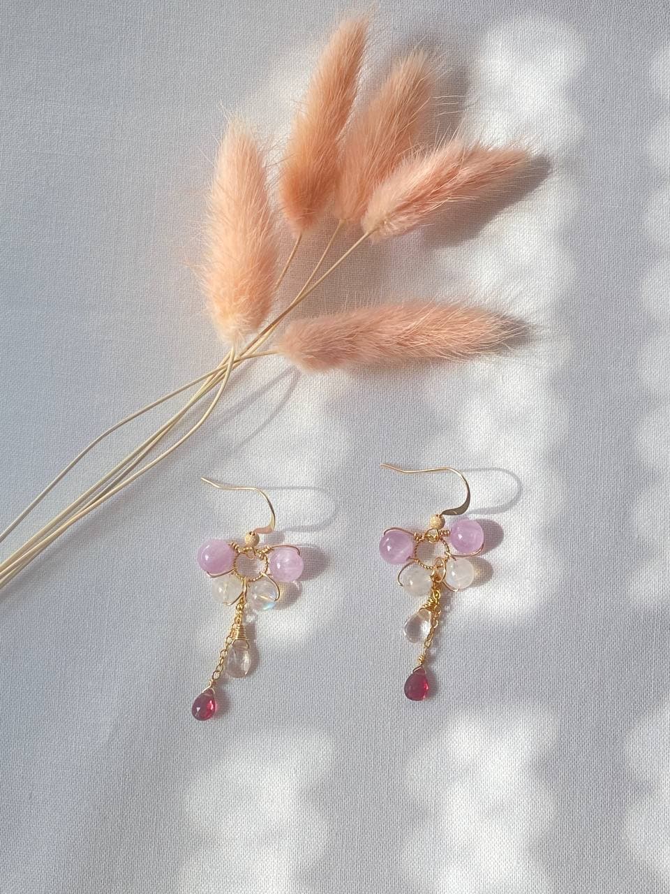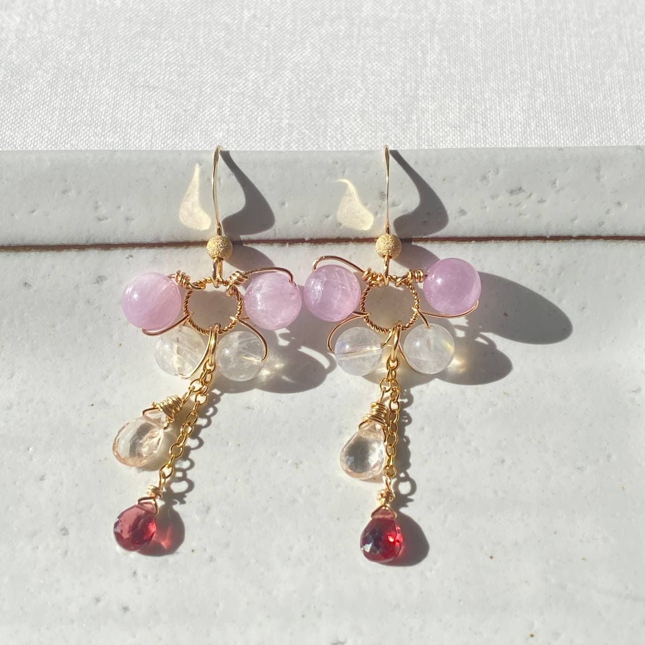 Kunzite, Moonstone, Rhodolite garnet, Brown topaz14K Gold-filled ear hook and hardware