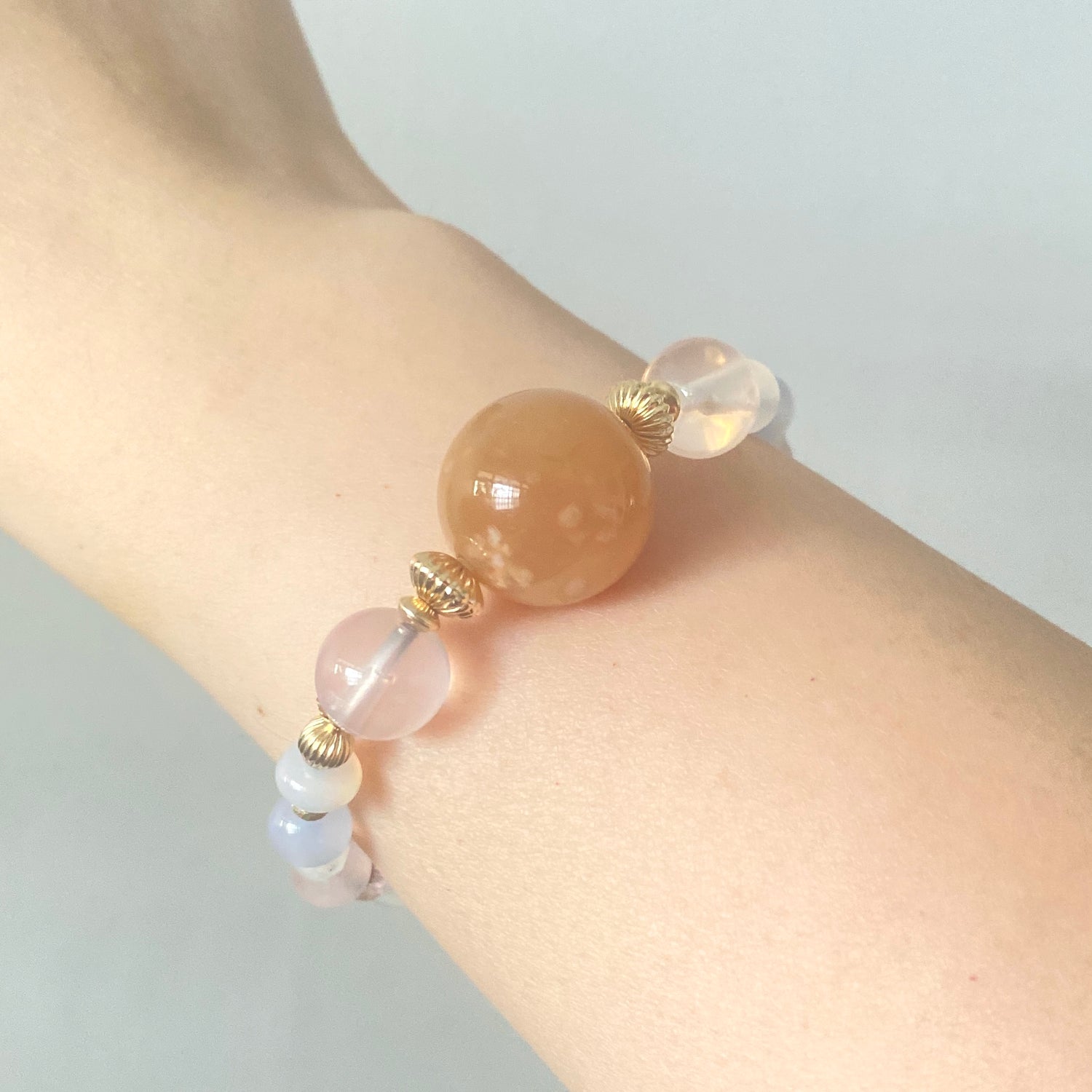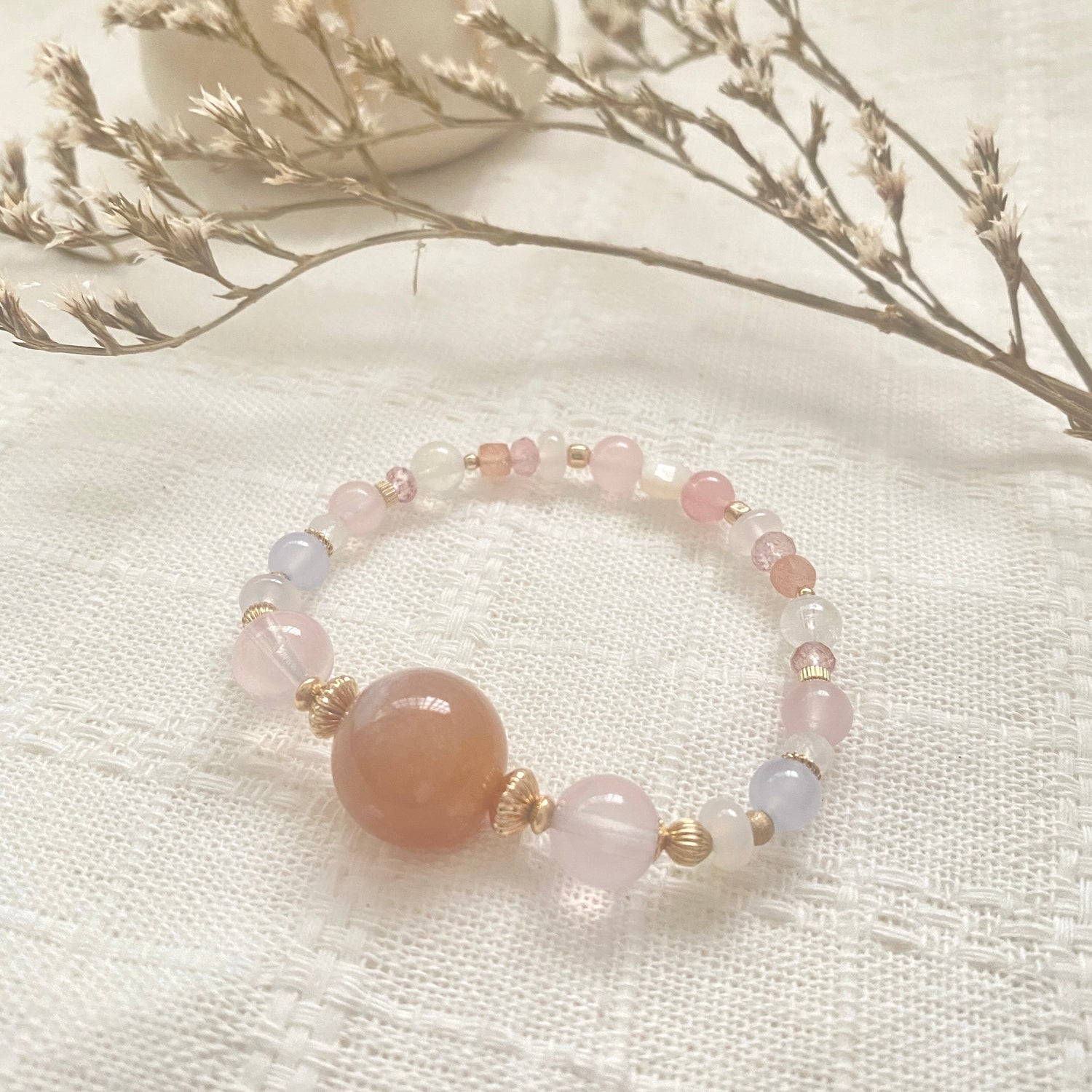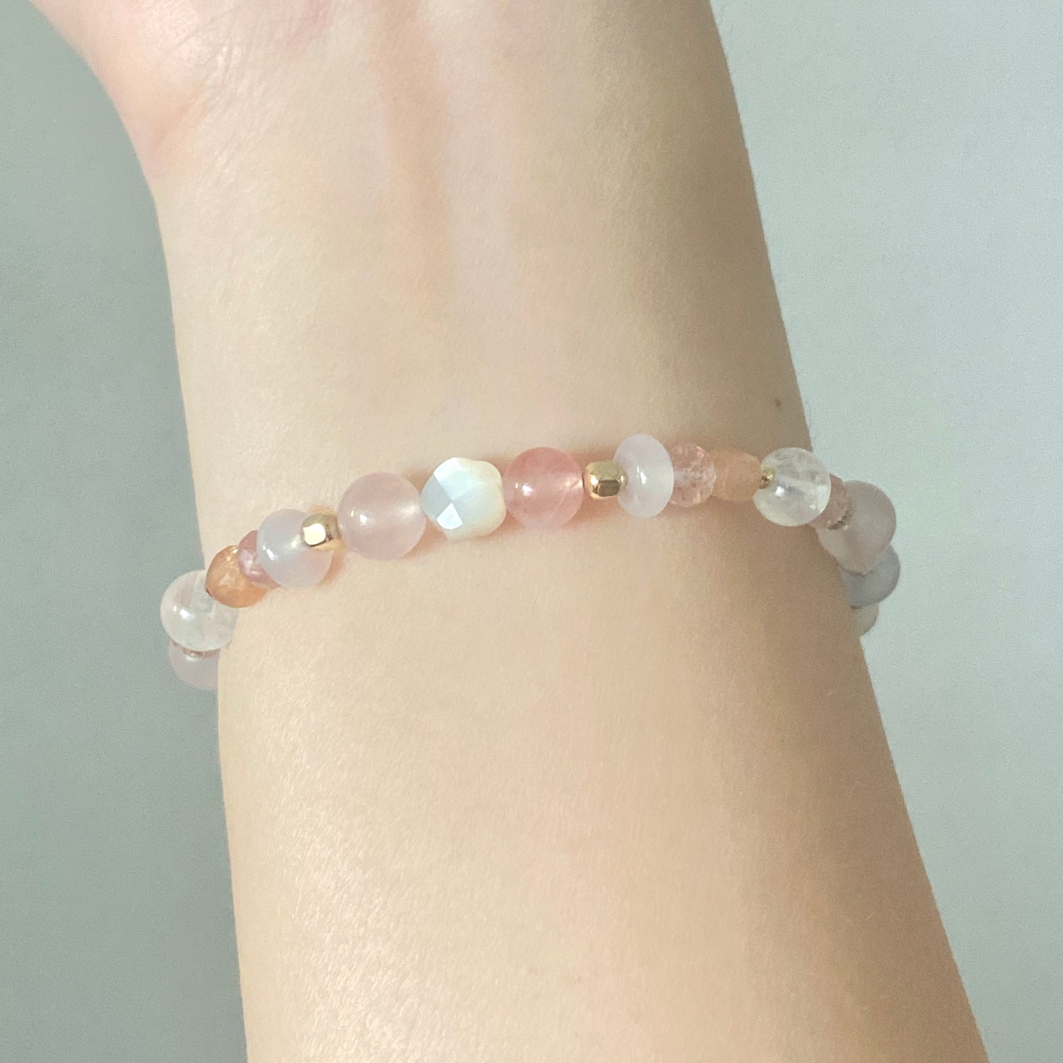 Flower agate (15mm), (Star) Rose quartz, White chalcedony, Blue chalcedony, Rose quartz, Orange moonstone, Pink epidote, Rainbow moonstone, Madagascar star rose quartz, White shell flower