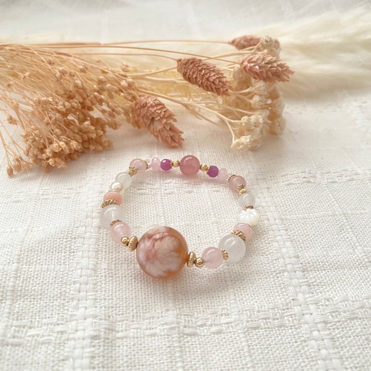 Flower agate (15mm), Rose quartz, White topaz, Blue chalcedony, Pink opal, hessonite garnet, Pink morganite, Rainbow moonstone, Madagascar star rose quartz, White shell flower, Ruby, Freshwater pearl, White moonstone
