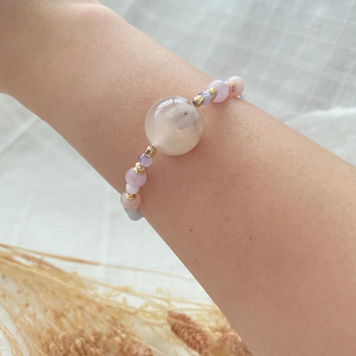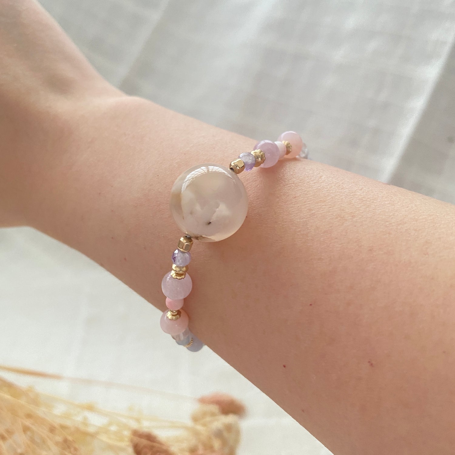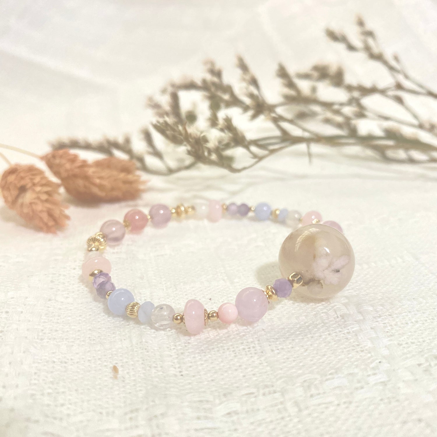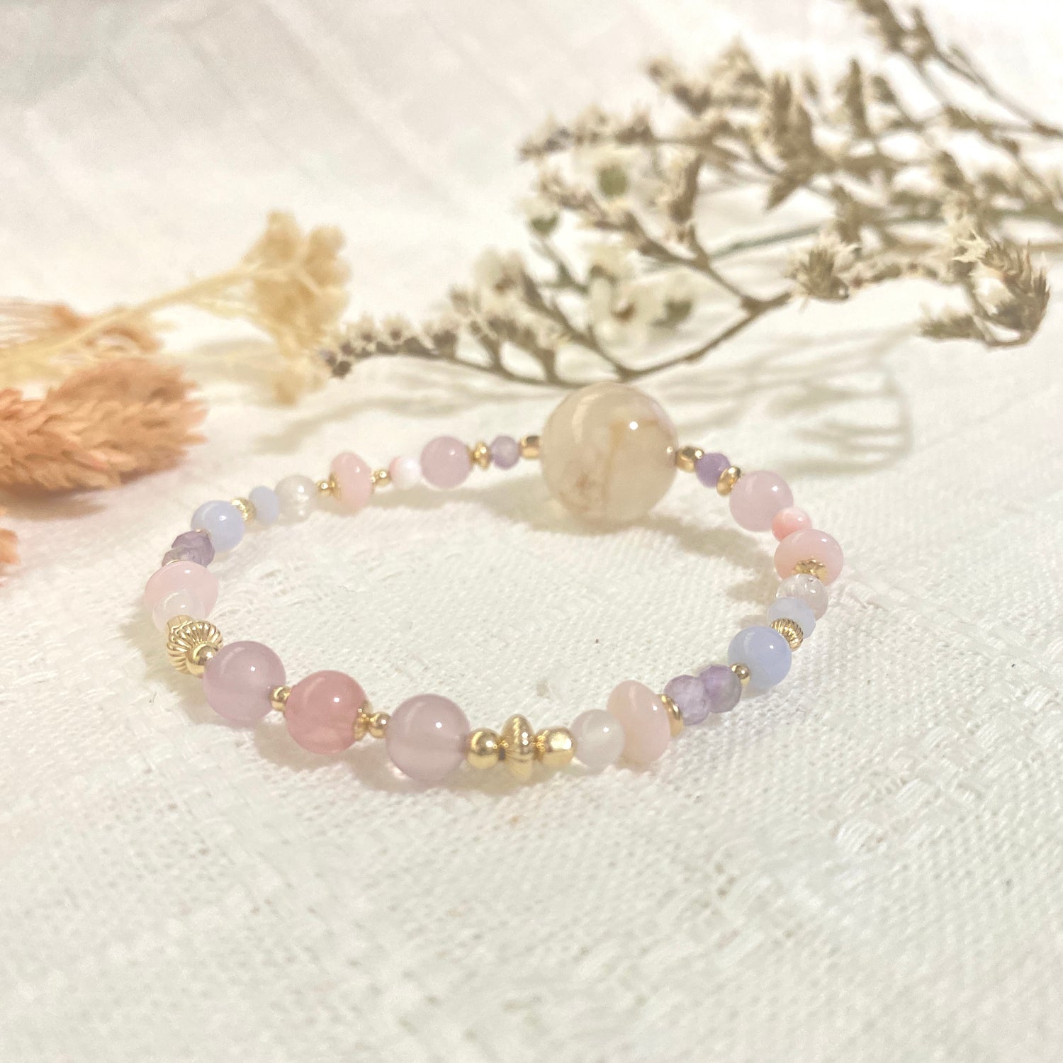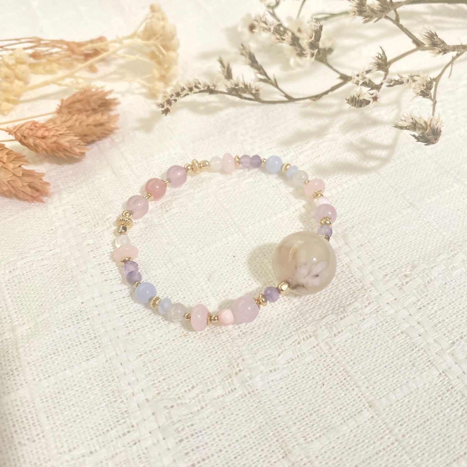 Flower agate (15mm), Kunzite, Pink opal, White chalcedony, Purple Chalcedony, Amethyst, Queen conch shell, Blur lace agate, Madagascar star rose quartz