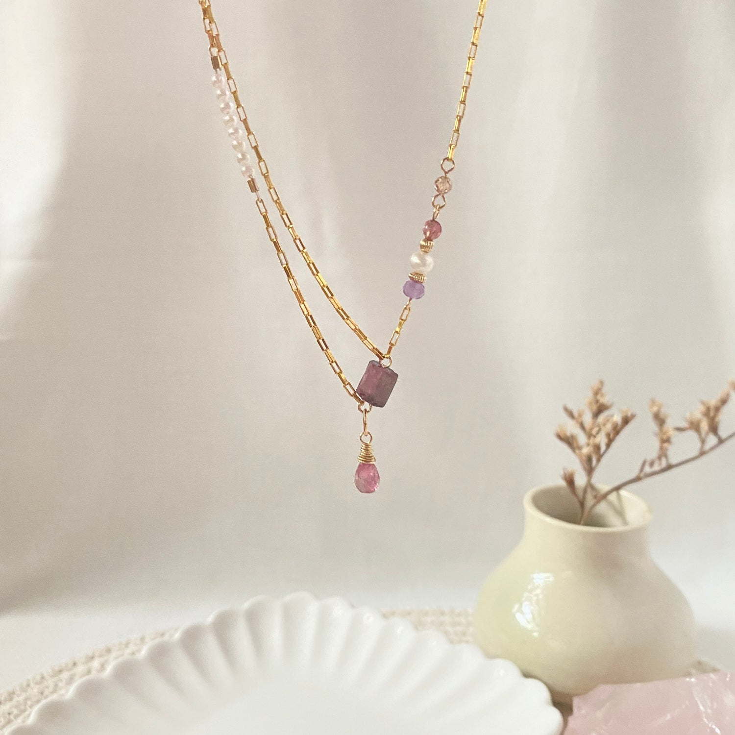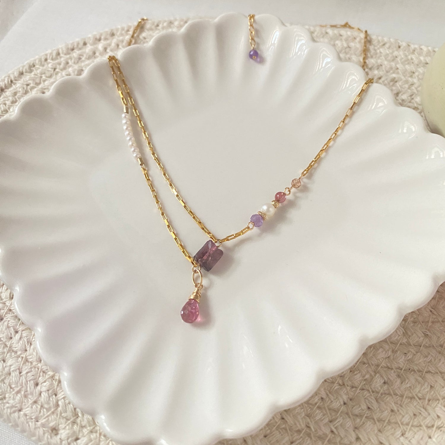 Purple tourmaline (6.6x5.9mm), Freshwater pearl, Amethyst, Orange zircon, Pink tourmaline