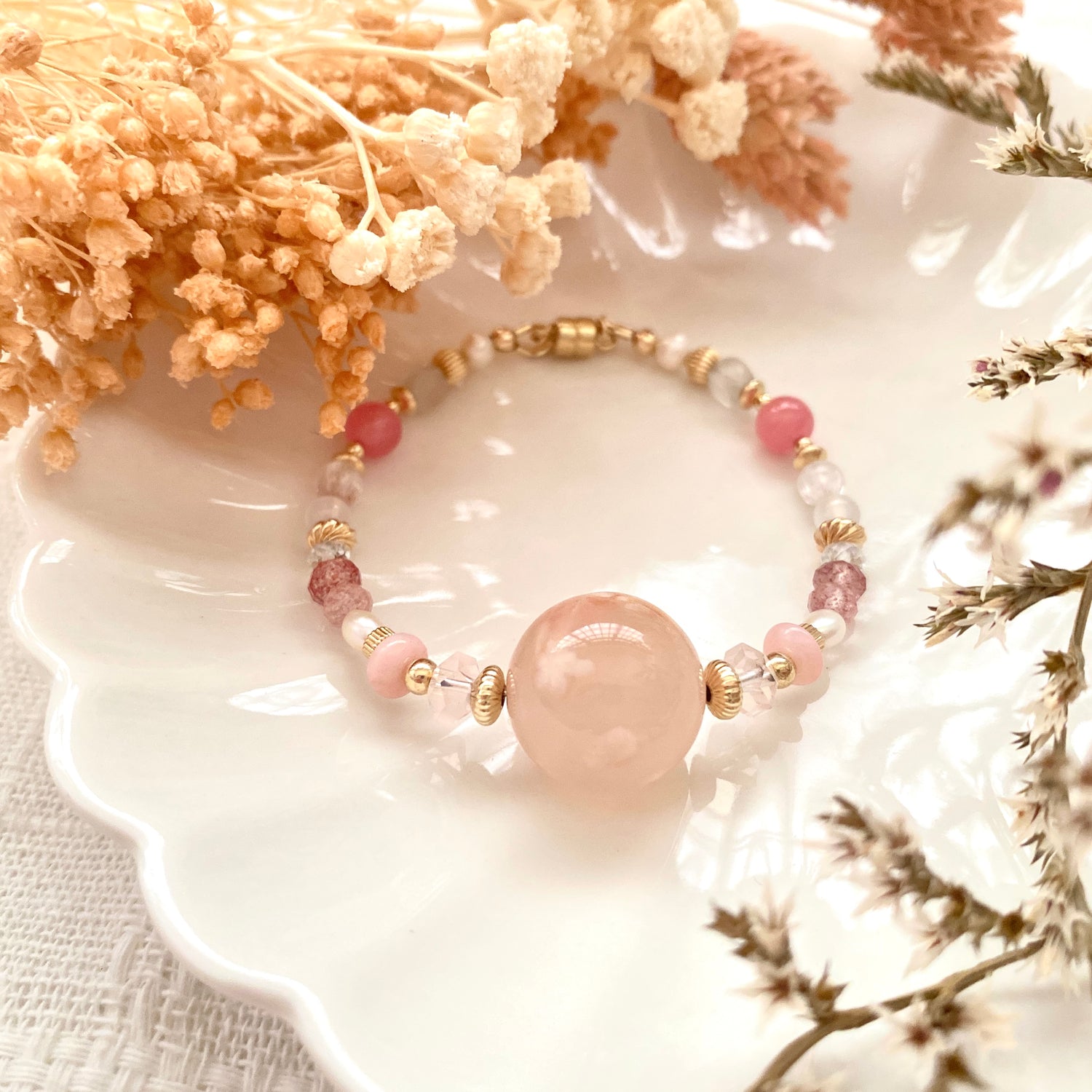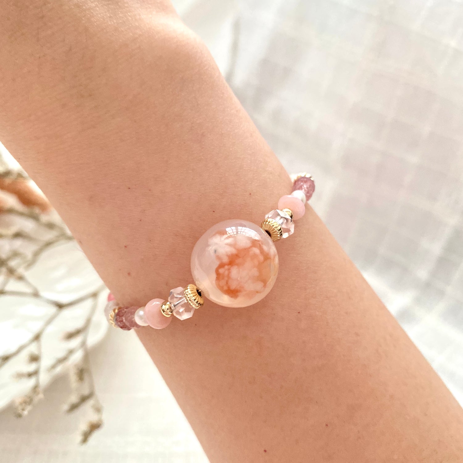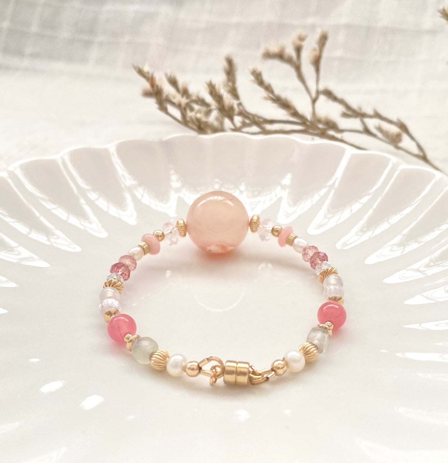 Flower agate (15mm), Rose quartz, Pink opal, Ice Rhodochrosite, White moonstone, Freshwater pearl, Pink epidote, Kunzite, White chalcedony, White topaz