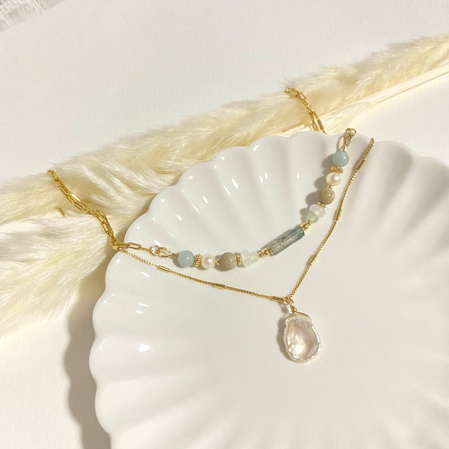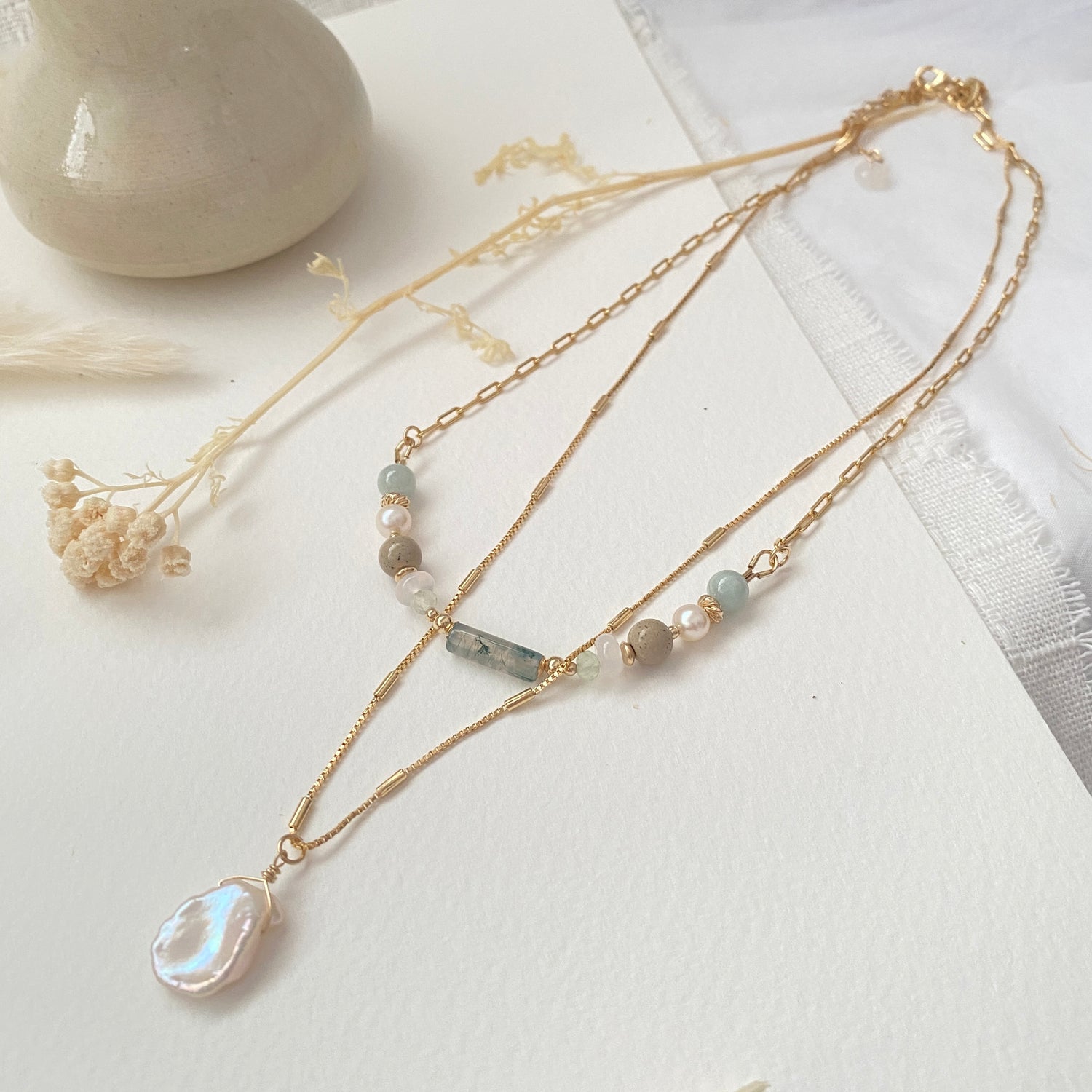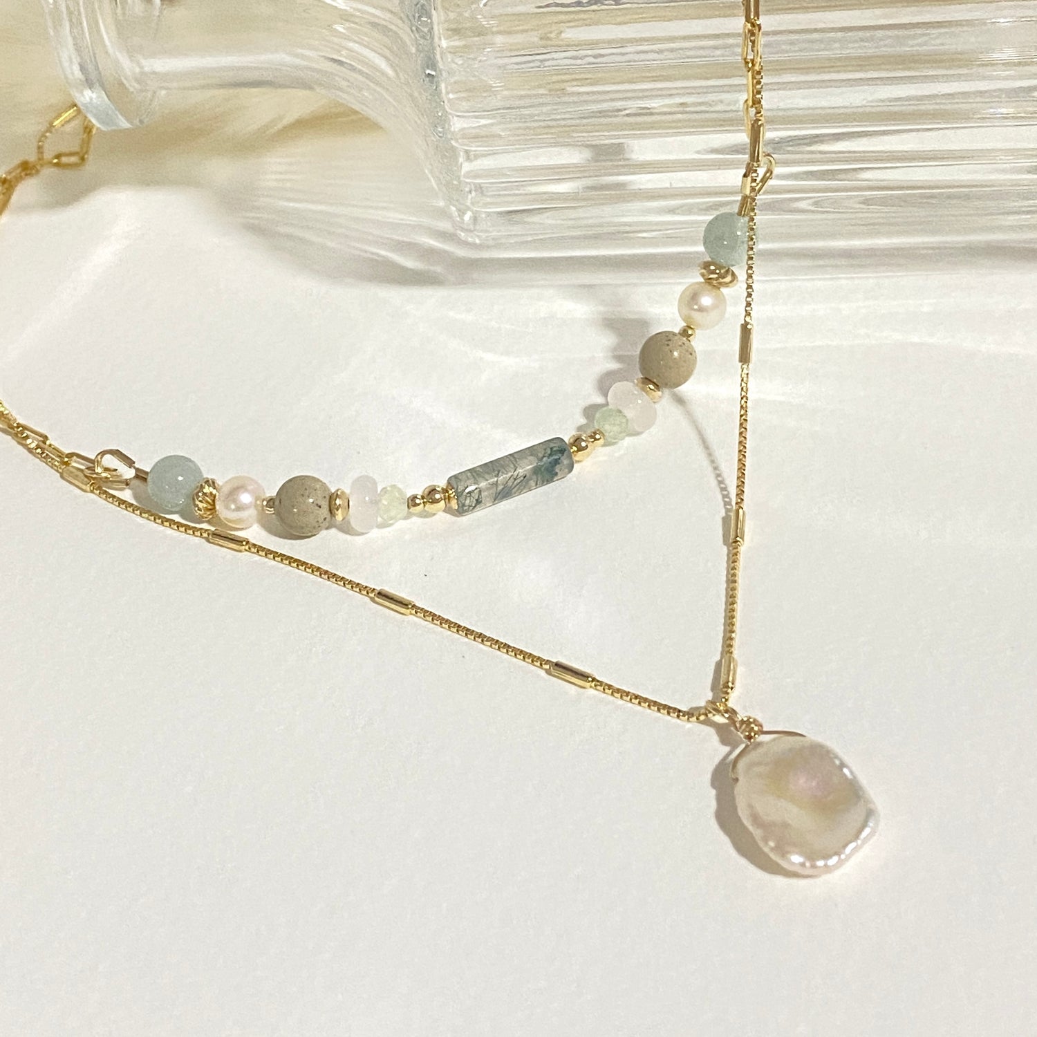 Moss agate, Prehnite, White Chalcedony, Hokutolite, Freshwater peal, Burmese Jade; Keishi pearl necklace (optional)
