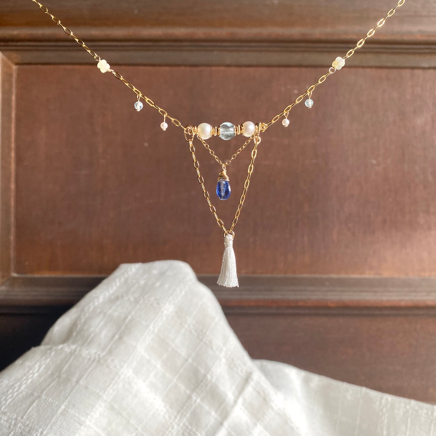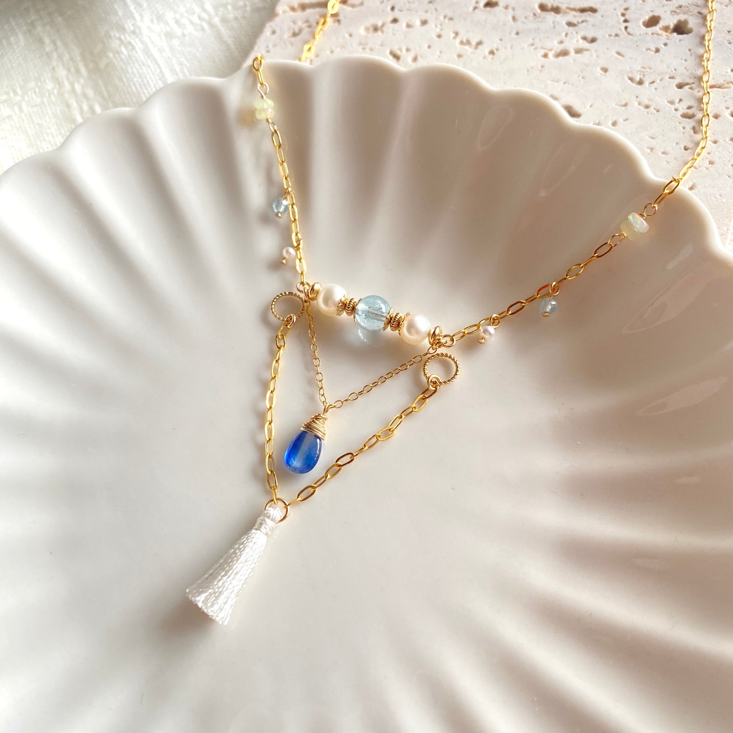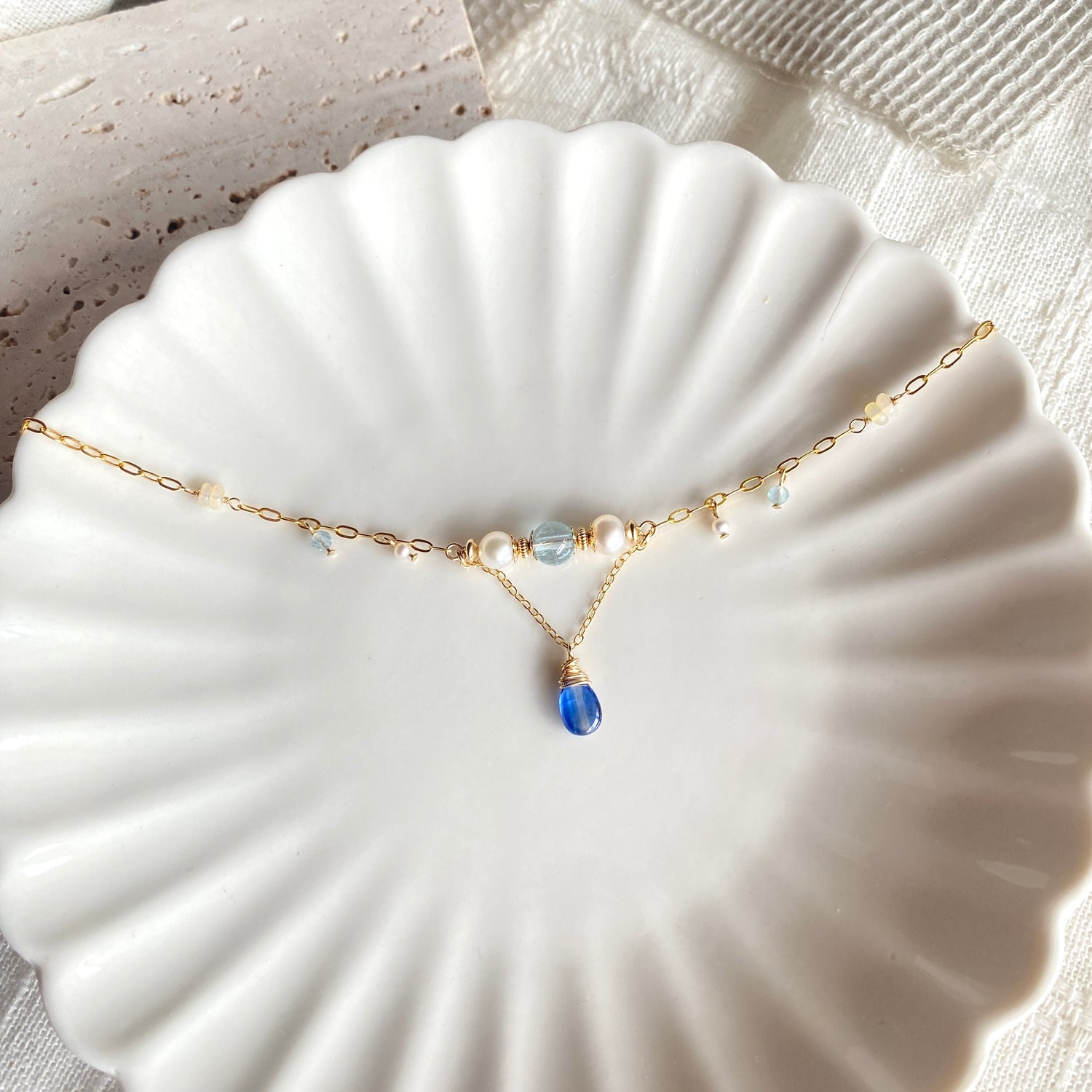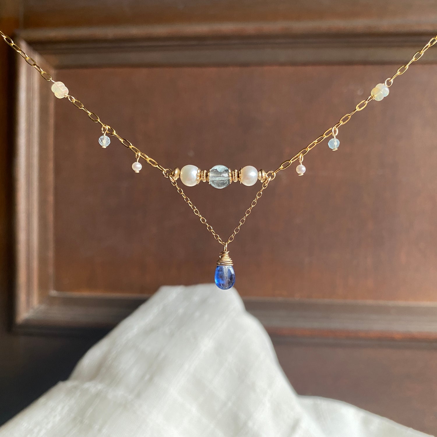 Sky blue topaz, Freshwater pearl, Kyanite, Aquamarine, Ethiopian opal