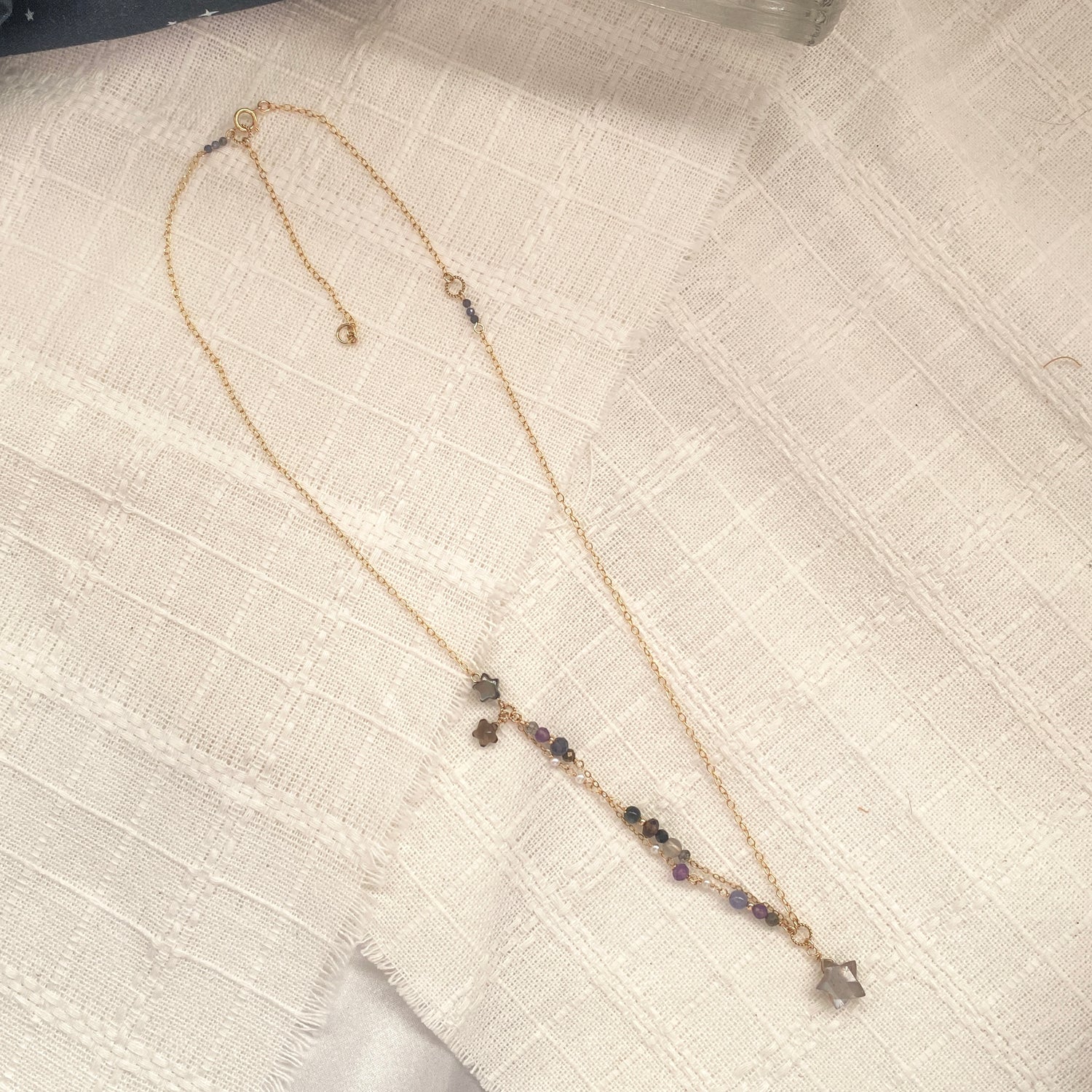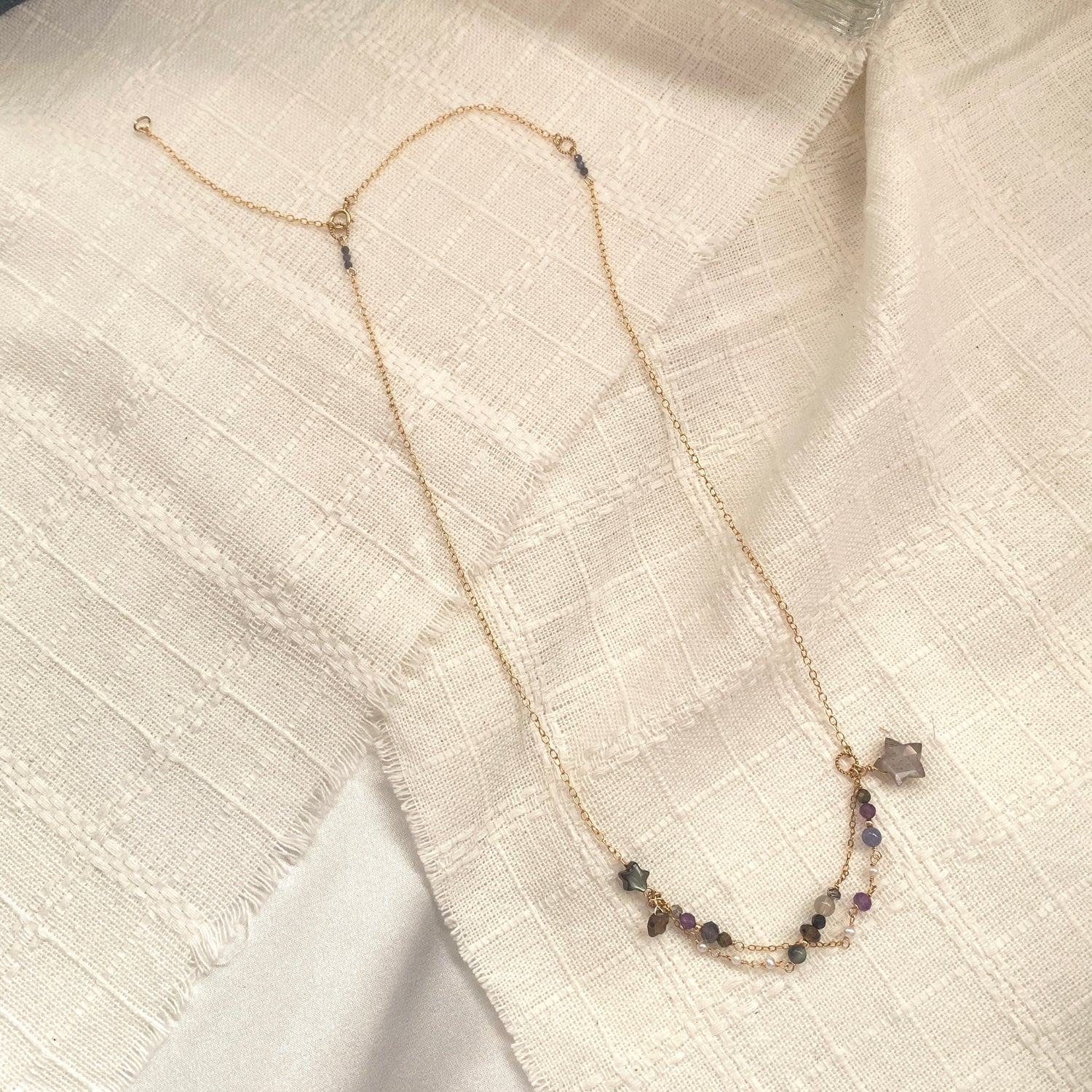 Gray Moonstone, Spinel, Amethyst, Tanzanite, Freshwater pearl, Smoky quartz, Black spinel, Tanzanite, Black oyster shell star, Blue sapphire