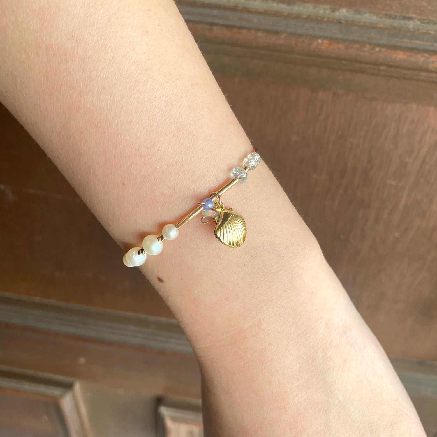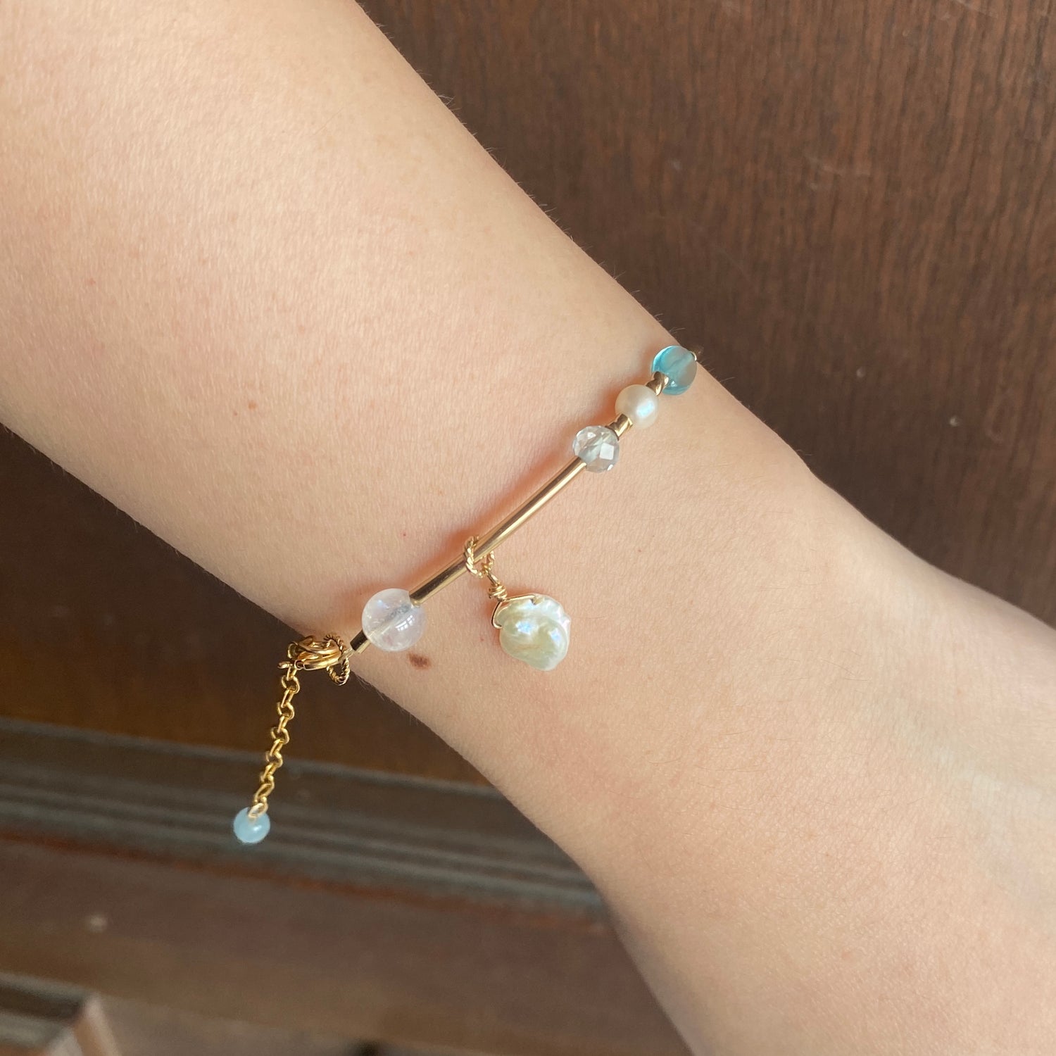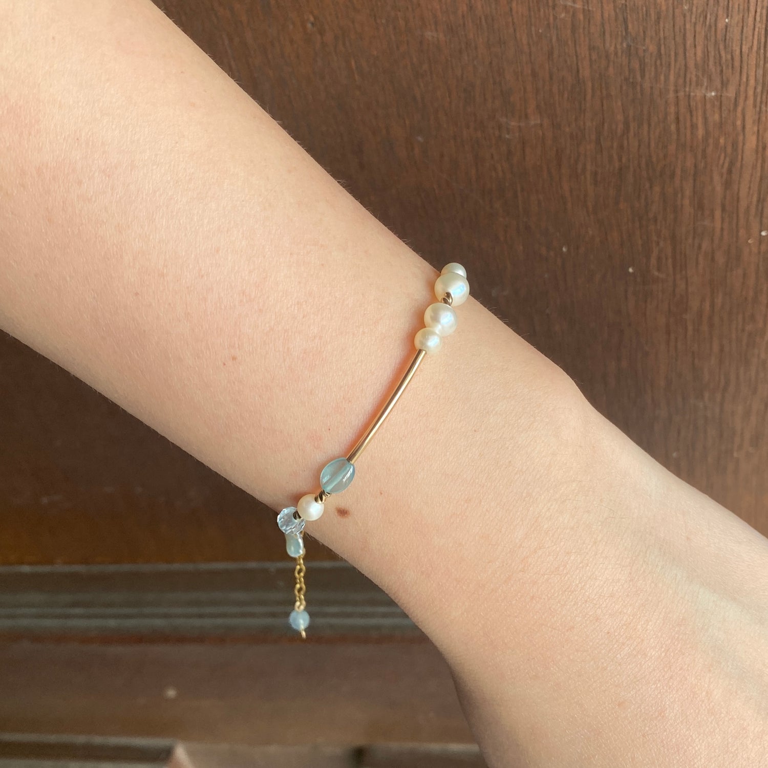 Freshwater pearl, Sky blue topaz, Blue Apatite, White topaz, Ethiopian opal, Tanzanite, Aquamarine