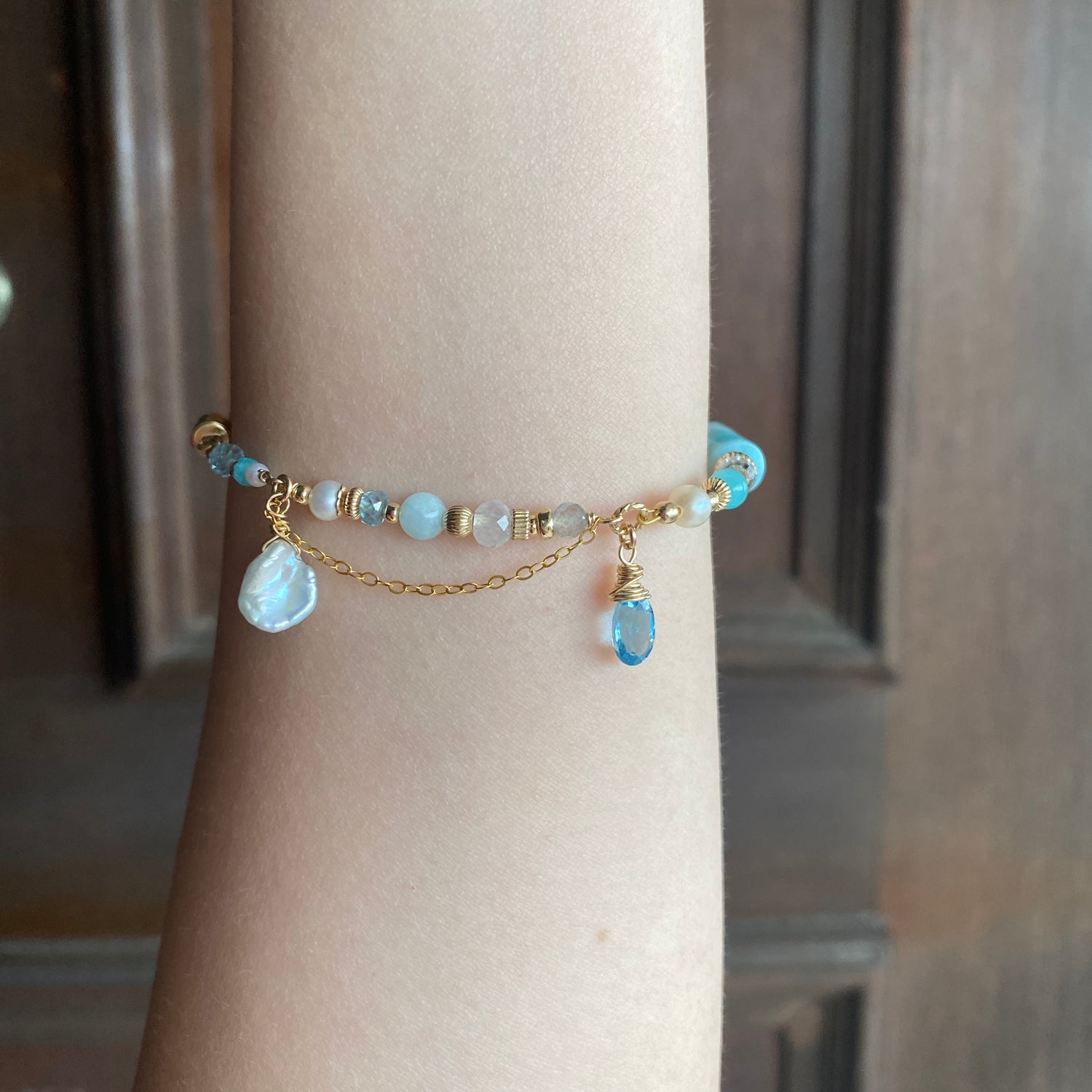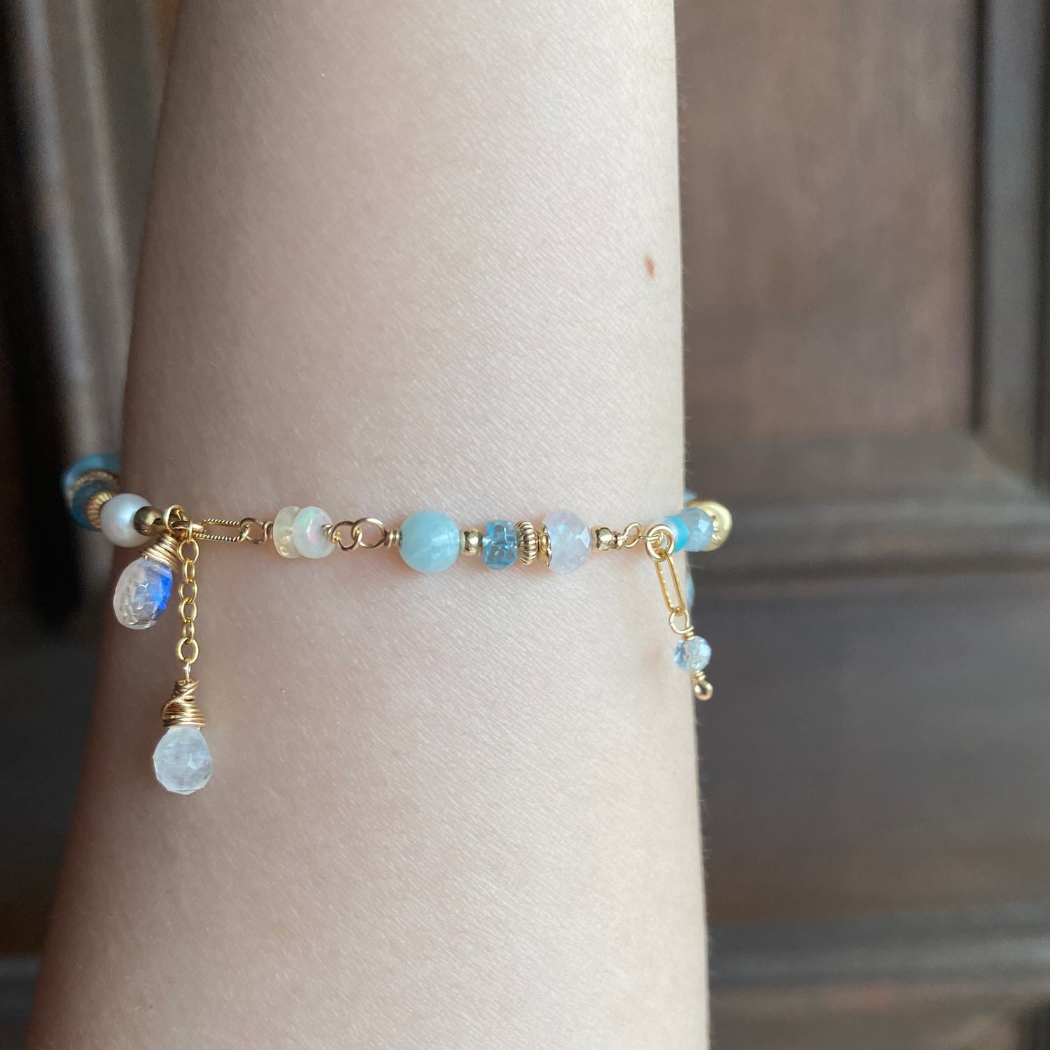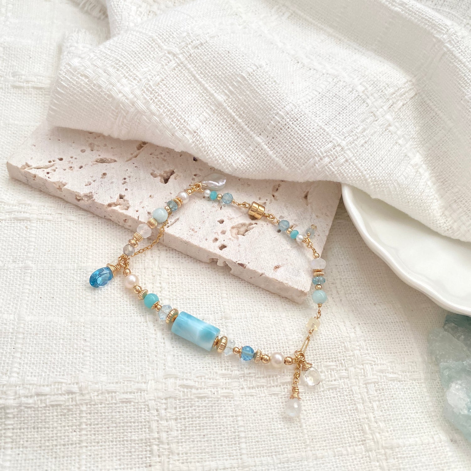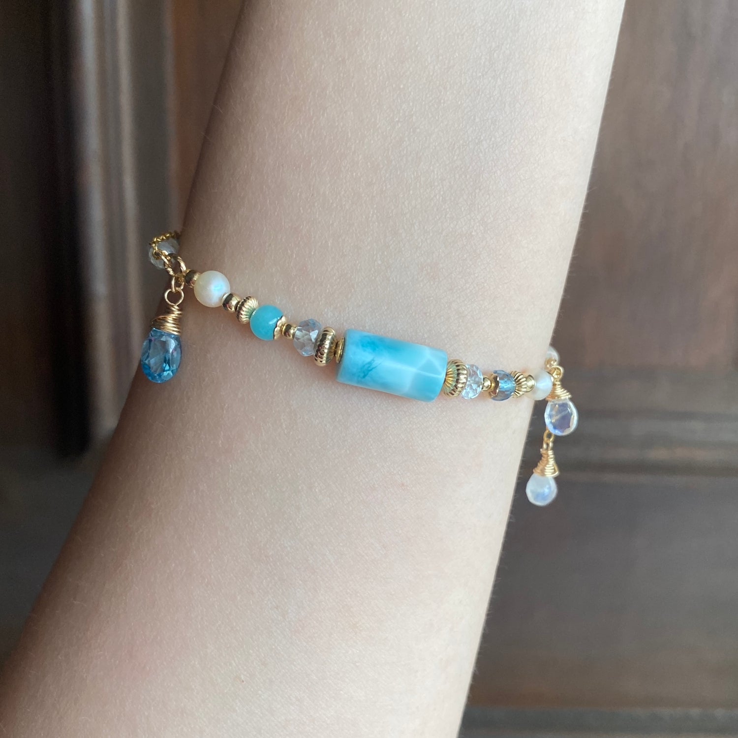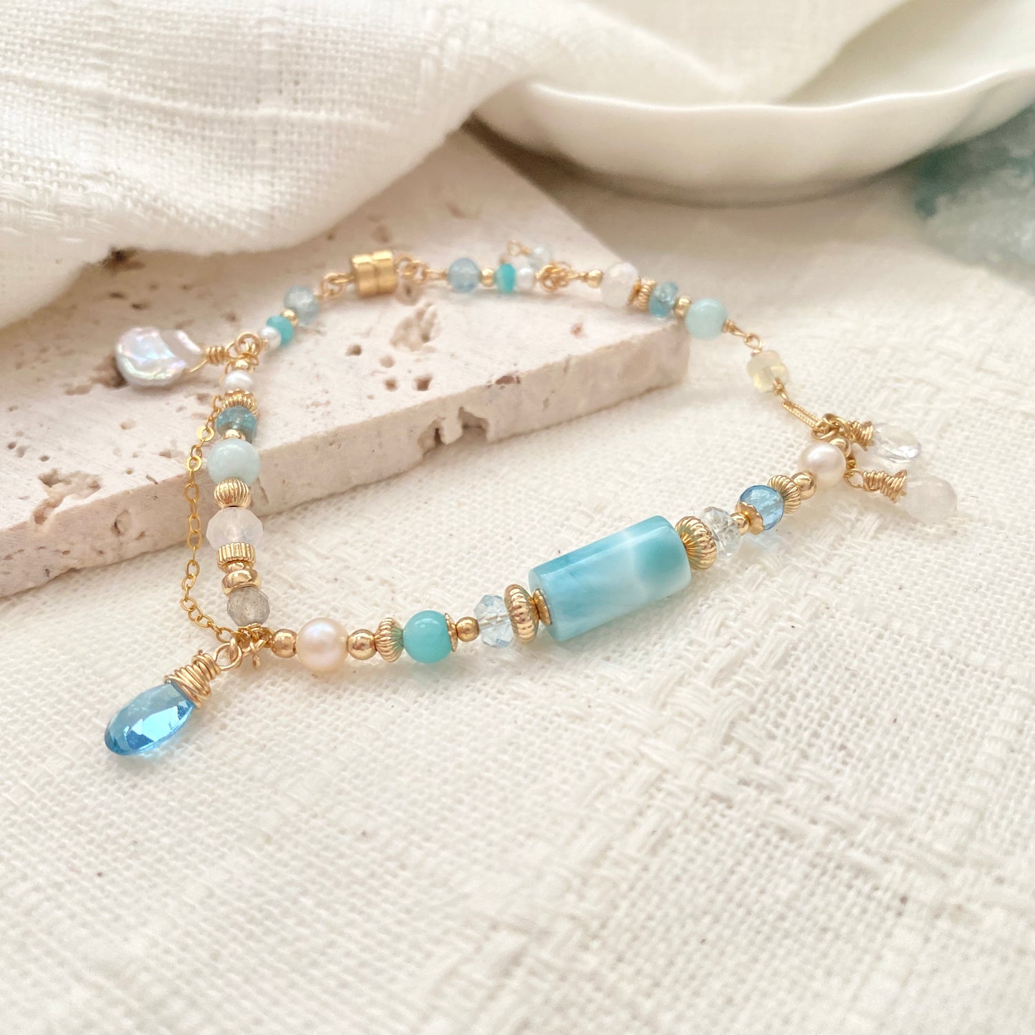 Larimar (12 x 6mm), Swiss blue topaz, Freshwater pearl, Sky blue topaz, Amazonite, Rainbow moonstone, labradorite, Aquamarine, Blue zircon, Ethiopian Opal, Keishi pearl