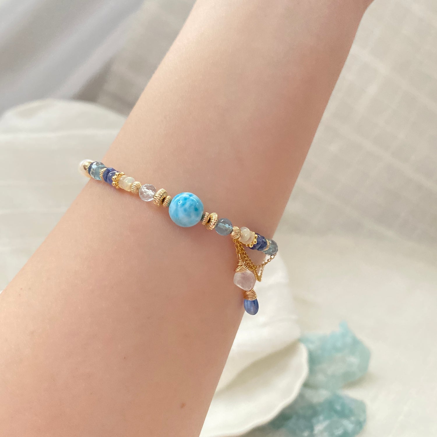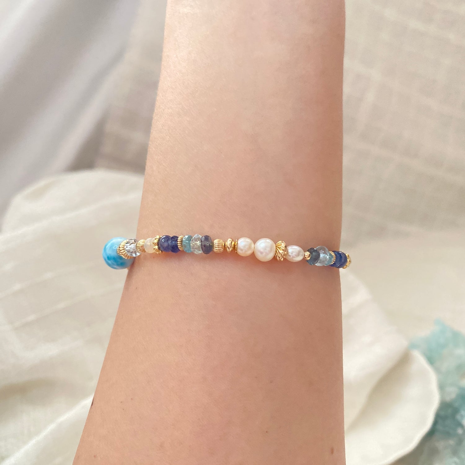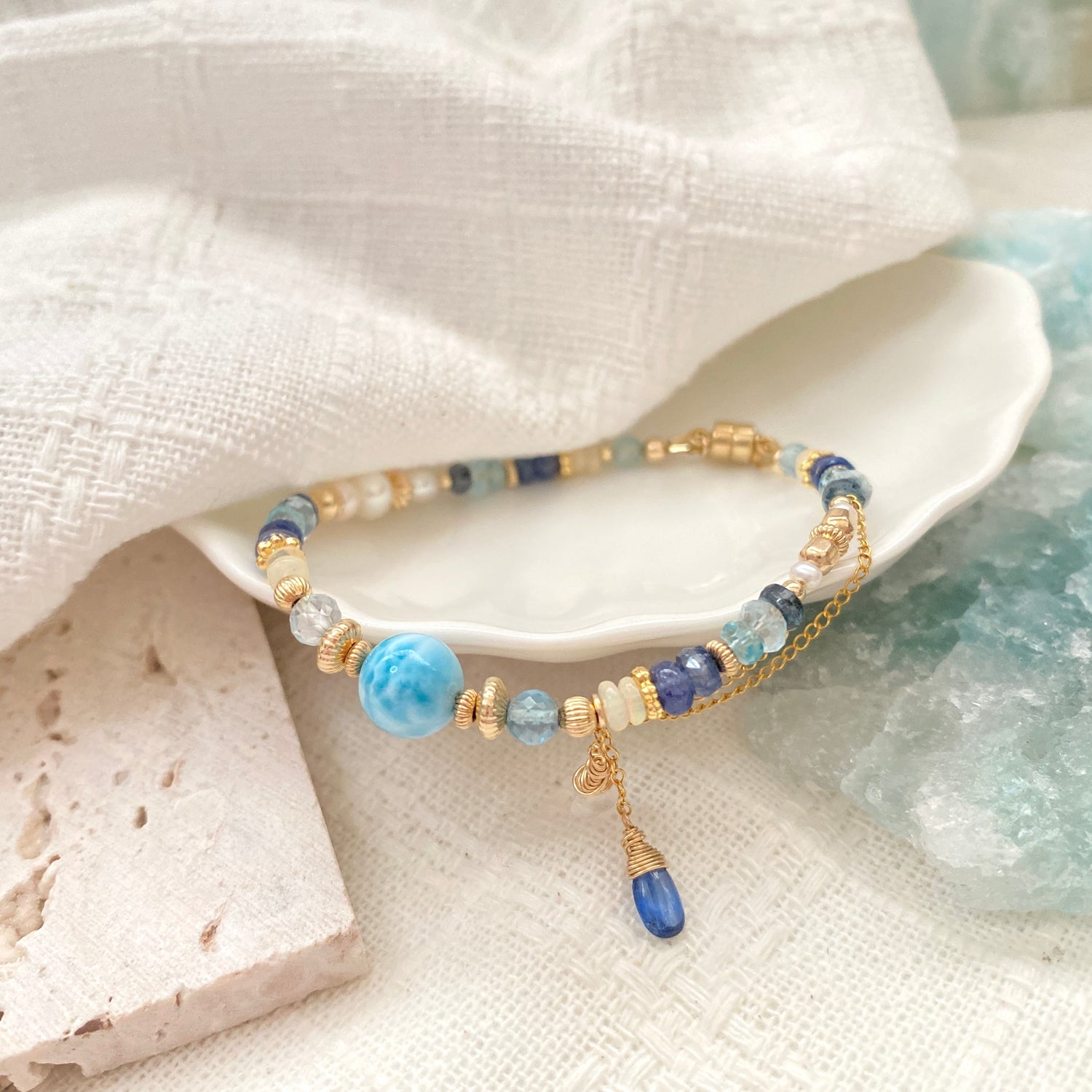 Larimar (8mm), Blue sapphire, Swiss blue topaz, Freshwater pearl, Sky blue topaz, Blue zircon, Kyanite, Deep blue kyanite, Ethiopian Opal, Rainbow moonstone, Aquamarine