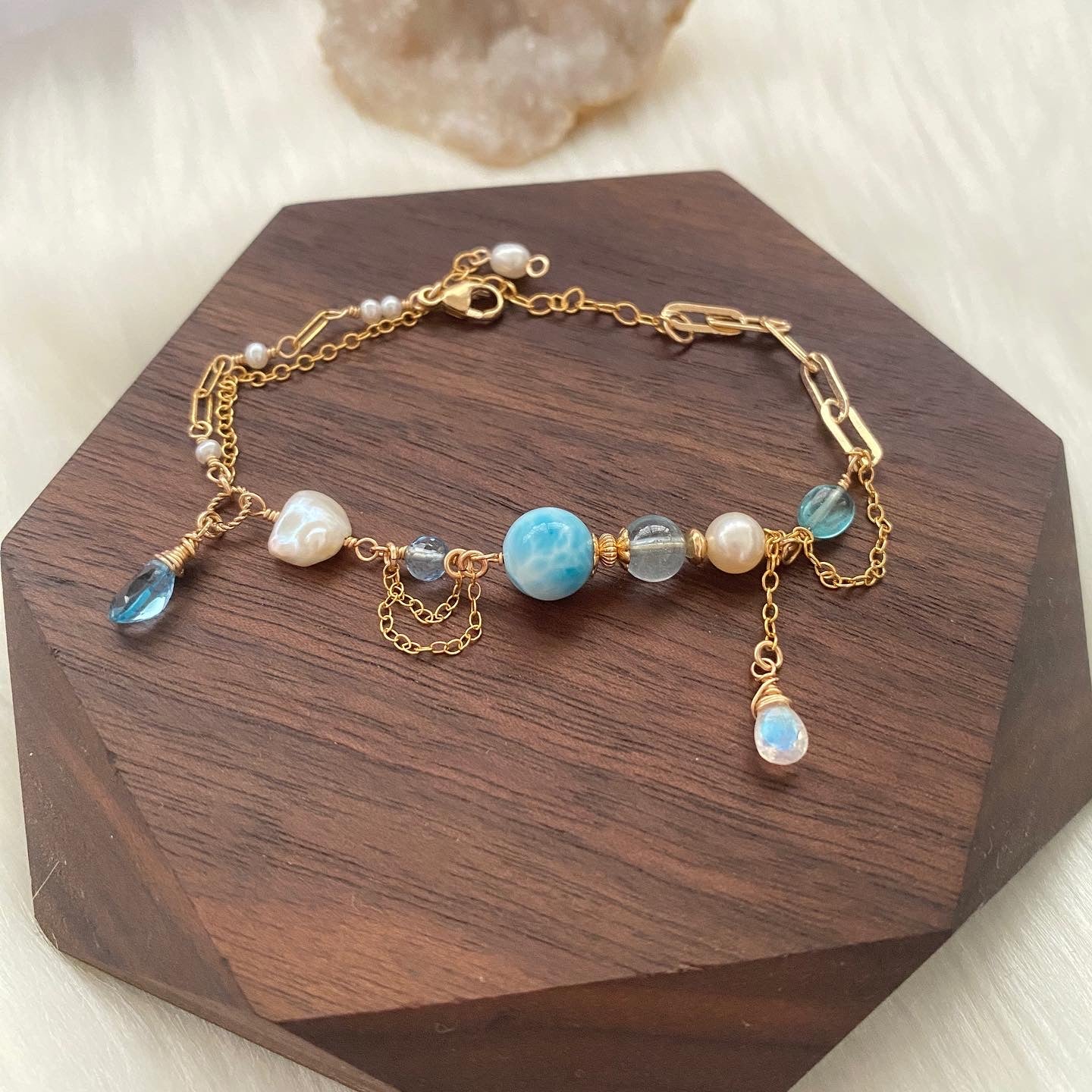 Larimar (8mm), Swiss blue topaz, Keishi pearl, Sky blue topaz. Rainbow moonstone, Freshwater pearl, Blue apatite