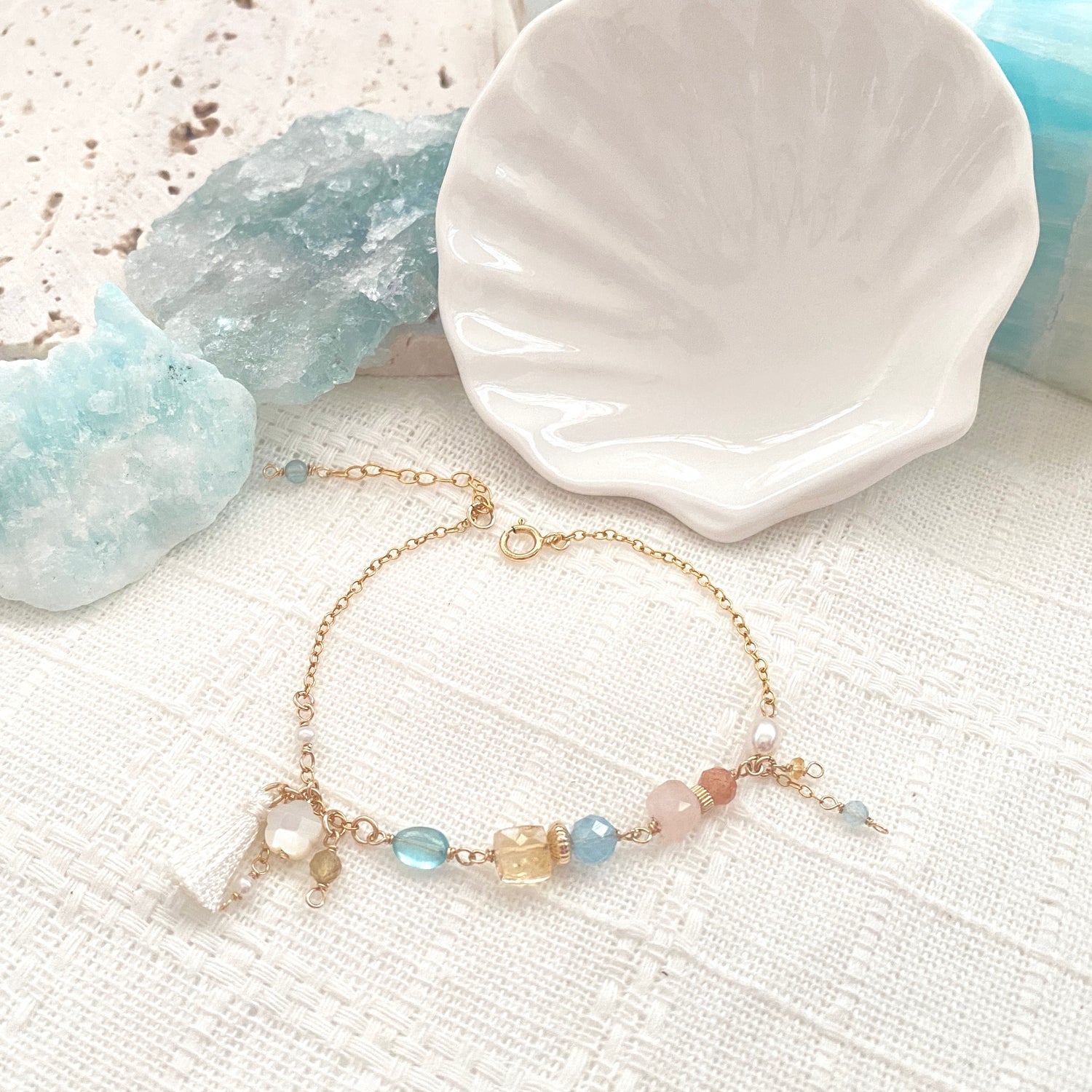 Freshwater pearl, Sunstone, Pink morganite, Aquamarine, Citrine, Blue Apatite, Brown tourmaline, Yellow sapphire, White shell flower